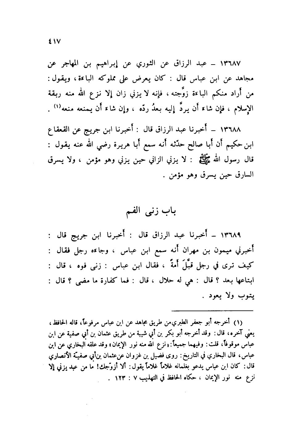 13688 - عَبْدُ الرَّزَّاقِ قَالَ: أَخْبَرَنَا ابْنُ جُرَيْجٍ، عَنِ الْقَعْقَاعِ بْنِ حَكِيمٍ، أَنَّ أَبَا صَالِحٍ، حَدَّثَهُ أَنَّهُ، سَمِعَ أَبَا هُرَيْرَةَ رَضِيَ اللَّهُ عَنْهُ يَقُولُ: قَالَ رَسُولُ اللَّهِ صَلَّى اللهُ عَلَيْهِ وَسَلَّمَ: «§لَا يَزْنِي الزَّانِي حِينَ يَزْنِي وَهُوَ مُؤْمِنٌ، وَلَا يَسْرِقُ السَّارِقُ حِينَ يَسْرِقُ وَهُوَ مُؤْمِنٌ»