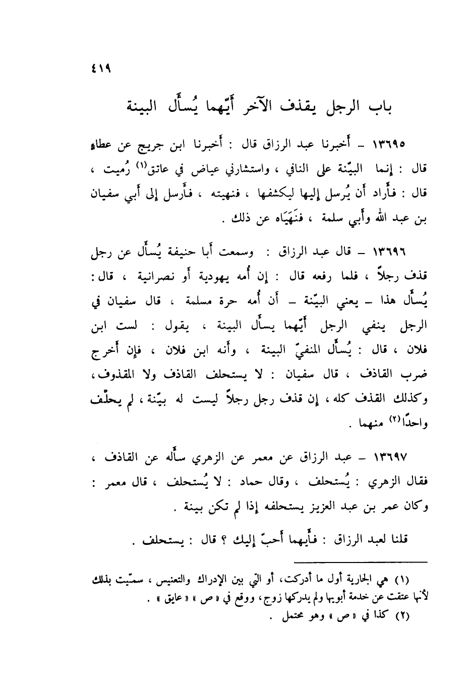 13696 - قَالَ عَبْدُ الرَّزَّاقِ: وَسَمِعْتُ أَبَا حَنِيفَةَ، يَسْأَلُ عَنْ رَجُلٍ قَذَفَ رَجُلًا فَلَمَّا رَفَعَهُ قَالَ: إِنَّ أُمَّهَ يَهُودِيَّةٌ أَوْ نَصْرَانِيَّةٌ قَالَ: «يُسْأَلُ هَذَا - يَعْنِي الْبَيِّنَةَ - أَنَّ أُمَّهَ حُرَّةٌ مُسْلِمَةٌ». قَالَ سُفْيَانُ فِي الرَّجُلِ يَنْفِي الرَّجُلَ أَيُّهُمَا يُسْأَلُ الْبَيِّنَةَ يَقُولُ: «لَسْتَ ابْنَ فُلَانٍ». قَالَ: يُسْأَلُ الْمُنْفَى الْبَيِّنَةَ، وَأَنَّهُ ابْنُ فُلَانٍ، فَإِنْ أَخْرَجَ ضُرِبَ الْقَاذِفُ، قَالَ سُفْيَانُ: " §لَا يُسْتَحْلَفُ الْقَاذِفُ، وَلَا الْمَقْذُوفُ، وَكَذَلِكَ الْقَذْفُ كُلُّهُ إِنْ قَذَفَ رَجُلٌ رَجُلًا: لَيْسَتْ لَهُ بَيِّنَةٌ لَمْ يُحَلَّفْ وَاحِدَا مِنْهُمَا "