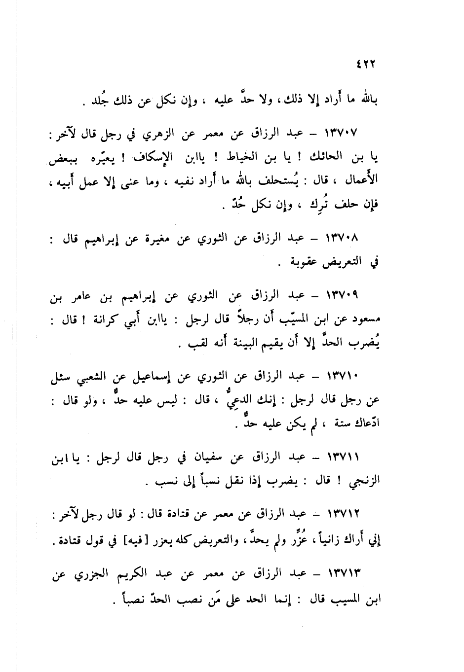13713 - عَنْ مَعْمَرٍ، عَنْ عَبْدِ الْكَرِيمِ الْجَزَرِيِّ، عَنِ ابْنِ الْمُسَيِّبِ قَالَ: «§إِنَّمَا الْحَدُّ عَلَى مَنْ نَصَبَ الْحَدَّ نَصْبًا»