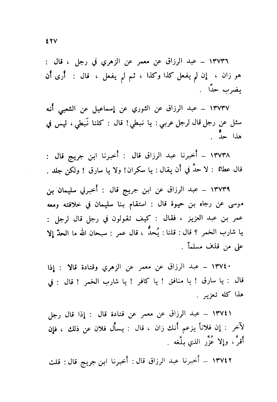 13738 - عَبْدُ الرَّزَّاقِ قَالَ: أَخْبَرَنَا ابْنُ جُرَيْجٍ قَالَ: قَالَ عَطَاءٌ: " §لَا حَدَّ فِي أَنْ يُقَالَ: يَا سَكْرَانُ، وَلَا يَا سَارِقُ، وَلَكِنْ جَلْدٌ "