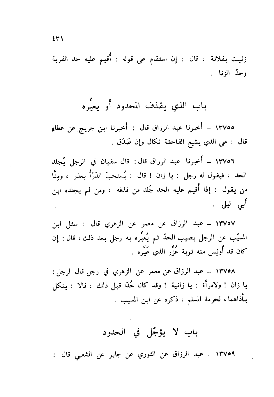 13756 - عَبْدُ الرَّزَّاقِ قَالَ: قَالَ سُفْيَانُ: فِي الرَّجُلِ يُجْلَدُ الْحَدَّ، فَيَقُولُ لَهُ رَجُلٌ: يَا زَانٍ قَالَ: " يُسْتَحَبُّ الدَّرْأُ بِعُذْرٍ، وَمِنَّا مَنْ يَقُولُ: «§إِذَا أُقِيمَ عَلَيْهِ الْحَدُّ جُلِدَ مَنْ قَذَفَهُ، وَمَنْ لَمْ يَجْلِدْهُ ابْنُ أَبِي لَيْلَى»