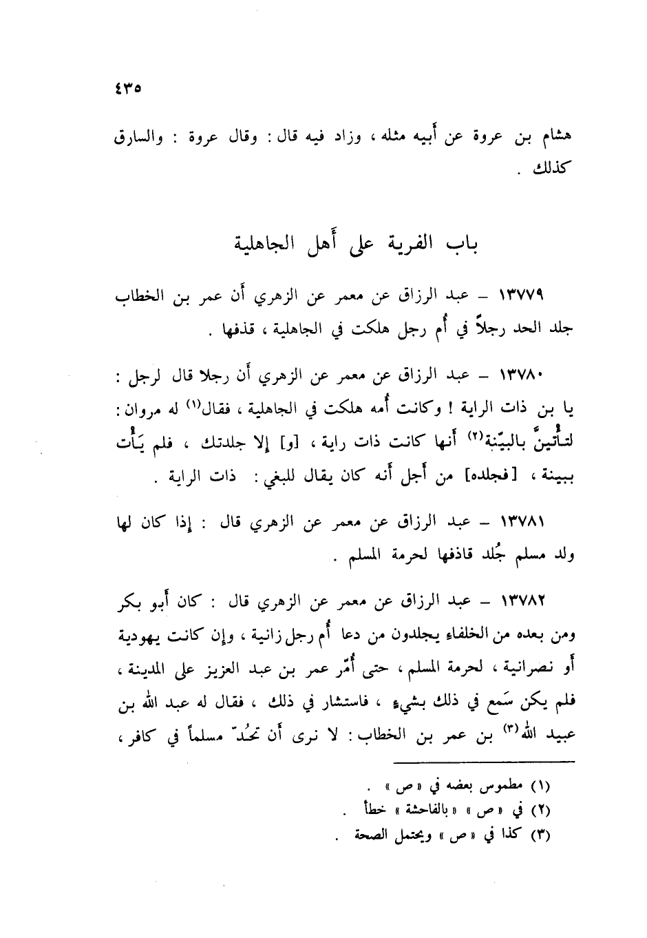 13782 - عَنْ مَعْمَرٍ، عَنِ الزُّهْرِيِّ قَالَ: كَانَ أَبُو بَكْرٍ وَمَنْ بَعْدَهُ مِنَ الْخُلَفَاءِ يَجْلِدُونَ مَنْ دَعَا أُمَّ رَجُلٍ زَانِيَةً، وَإِنْ كَانَتْ يَهُودِيَّةً أَوْ نَصْرَانِيَّةً لِحُرْمَةِ الْمُسْلِمِ، حَتَّى أُمِّرَ عُمَرُ بْنُ عَبْدِ الْعَزِيزِ عَلَى الْمَدِينَةِ، فَلَمْ يَكُنْ سَمِعَ فِي ذَلِكَ بِشَيْءٍ، فَاسْتَشَارَ فِي ذَلِكَ، فَقَالَ لَهُ عَبْدُ اللَّهِ بْنُ عُبَيْدِ اللَّهِ بْنِ عُمَرَ بْنِ الْخَطَّابِ: «§لَا نَرَى أَنْ تَحُدَّ مُسْلِمًا فِي كَافِرٍ، فَتَرَكَ الْحَدَّ بَعْدَ ذَلِكَ الْيَوْمِ»