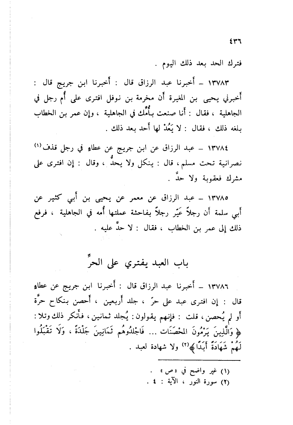 13786 - عَبْدُ الرَّزَّاقِ قَالَ: أَخْبَرَنَا ابْنُ جُرَيْجٍ، عَنْ عَطَاءٍ قَالَ: «§إِنِ افْتَرَى عَبْدٌ عَلَى حُرٍّ جُلِدَ أَرْبَعِينَ أَحْصَنَ بِنِكَاحِ حُرَّةٍ، أَوْ لَمْ يُحْصَنْ». قُلْتُ: فَإِنَّهُمْ يَقُولُونَ: يُجْلَدُ ثَمَانِينَ، فَأَنْكَرَ ذَلِكَ، وَتَلَا: {وَالَّذِينَ يَرْمُونَ الْمُحْصَنَاتِ ثُمَّ لَمْ يَأْتُوا بِأَرْبَعَةِ شُهَدَاءِ فَاجْلِدُوهُمْ ثَمَانِينَ جَلْدَةً وَلَا تَقْبَلُوا لَهُمْ شَهَادَةً أَبَدًا} [النور: 4] وَلَا شَهَادَةَ لِعَبْدٍ "