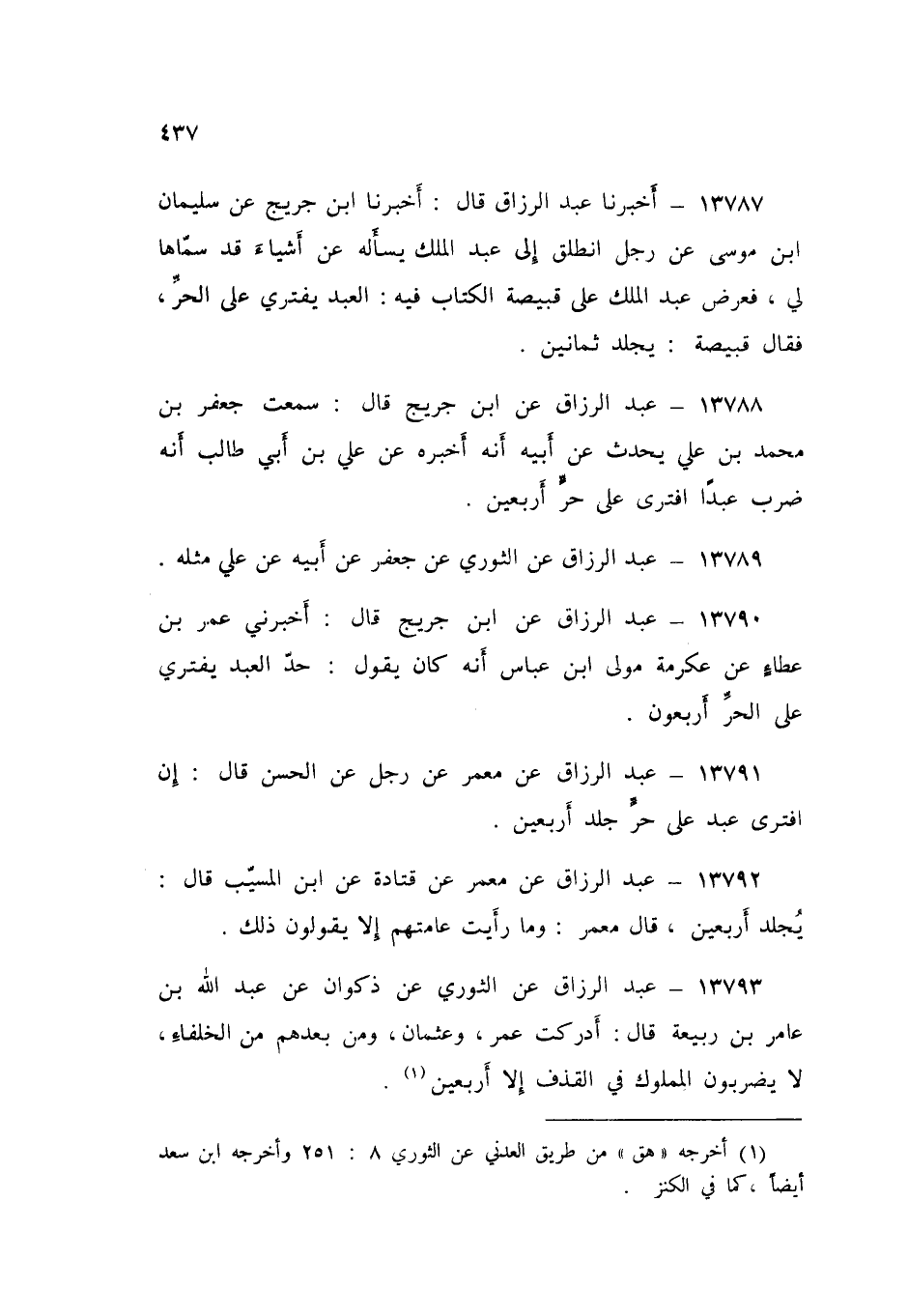 13790 - عَنِ ابْنِ جُرَيْجٍ قَالَ: أَخْبَرَنِي عُمَرُ بْنُ عَطَاءٍ، عَنْ عِكْرِمَةَ مَوْلَى ابْنِ عَبَّاسٍ أَنَّهُ كَانَ يَقُولُ: «§حَدُّ الْعَبْدِ يَفْتَرِي عَلَى الْحُرِّ أَرْبَعُونَ»