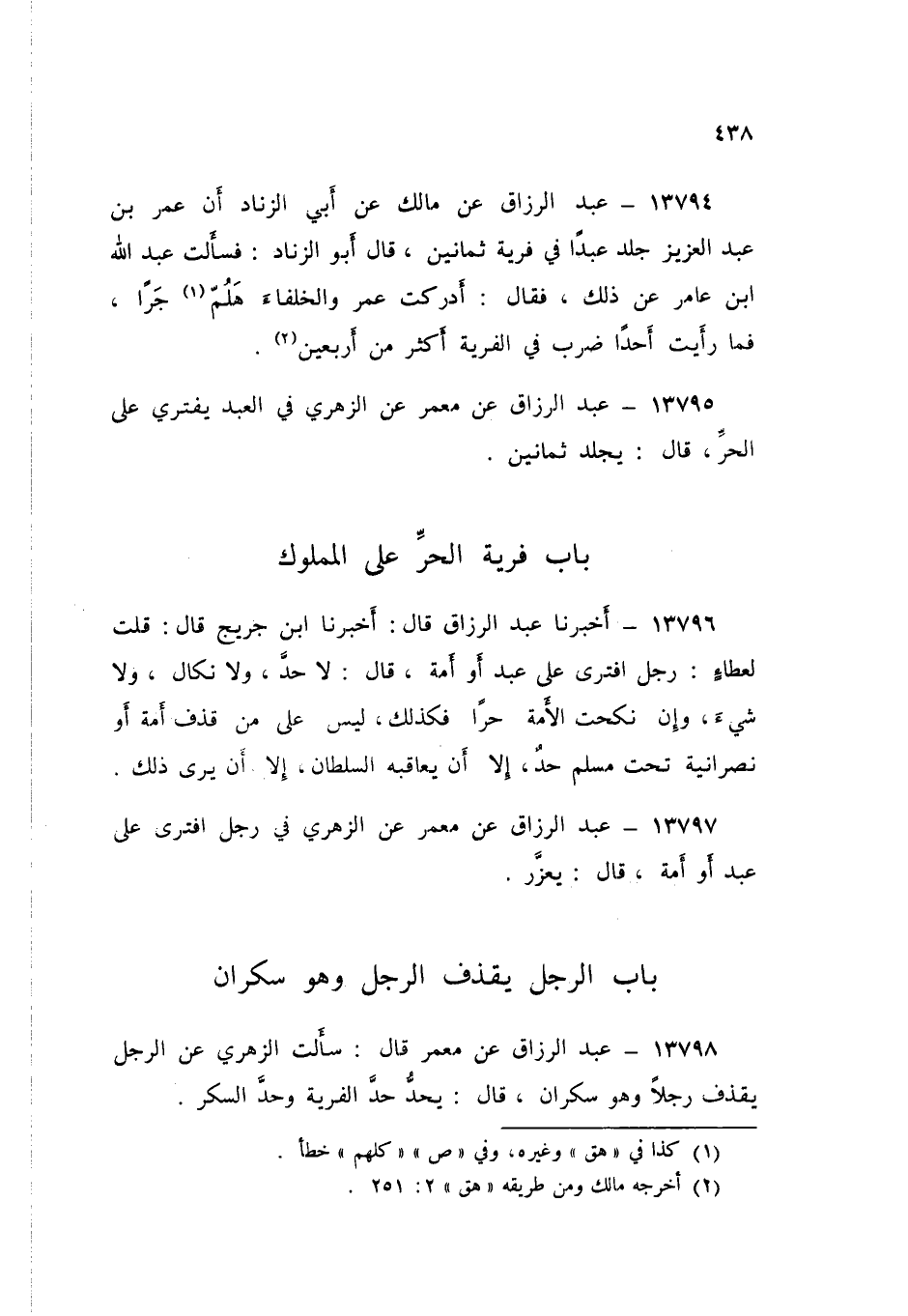 13798 - عَنْ مَعْمَرٍ قَالَ: سَأَلْتُ الزُّهْرِي، عَنِ الرَّجُلِ يَقْذِفُ رَجُلًا وَهُوَ سَكْرَانُ قَالَ: «§يُحَدُّ حَدَّ الْفِرْيَةِ، وَحَدَّ السُّكْرِ»