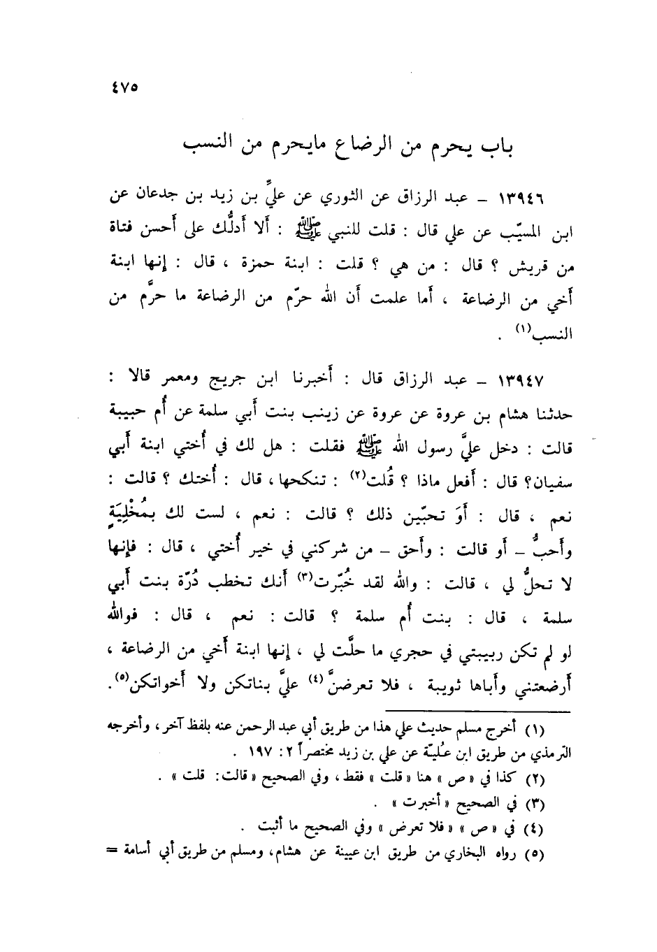 13947 - عَبْدُ الرَّزَّاقِ، أَخْبَرَنَا ابْنُ جُرَيْجٍ، وَمَعْمَرٌ، قَالَا: حَدَّثَنَا هِشَامُ بْنُ عُرْوَةَ، عَنْ عُرْوَةَ، عَنْ زَيْنَبَ بِنْتِ أَبِي سَلَمَةَ، عَنْ أُمِّ حَبِيبَةَ قَالَتْ: دَخَلَ عَلَيَّ رَسُولُ اللَّهِ صَلَّى اللهُ عَلَيْهِ وَسَلَّمَ، فَقُلْتُ: هَلْ لَكَ فِي أُخْتِي ابْنَةِ أَبِي سُفْيَانَ؟ قَالَ: «أفْعَلُ مَاذَا؟» قُلْتُ: تَنْكِحُهَا. قَالَ: «أُخْتُكِ؟» قَالَتْ: نَعَمْ. قَالَ: «أَوَ تُحِبِّينَ ذَلِكَ؟» قَالَتْ: نَعَمْ، لَسْتُ لَكَ بِمُخْلِيَةٍ، وَأُحِبُّ - أَوْ قَالَتْ: وَأَحَقُّ - مِنْ شِرْكَتِي فِي خَيْرٍ أُخْتِي. قَالَ: «فَإنَّهَا لَا تَحِلُّ لِي». قَالَتْ: وَاللَّهِ، لَقَدْ خُبِّرْتُ أَنَّكَ تَخْطُبُ دُرَّةَ بِنْتَ أَبِي سَلَمَةَ. قَالَ: «بِنْتُ أُمِّ سَلَمَةَ؟» قَالَتْ: نَعَمْ. قَالَ: «فَوَاللَّهِ لَوْ لَمْ تَكُنْ رَبِيبَتِي فِي حِجْرِي مَا حَلَّتْ لِي، إِنَّهَا ابْنَةُ أَخِي مِنَ الرَّضَاعَةِ أَرْضَعَتْنِي وَأَبَاهَا ثُوَيْبَةُ، §فَلَا تَعْرِضُنَّ عَلَيَّ بَنَاتَكُنَّ وَلَا أَخَوَاتِكُنَّ»