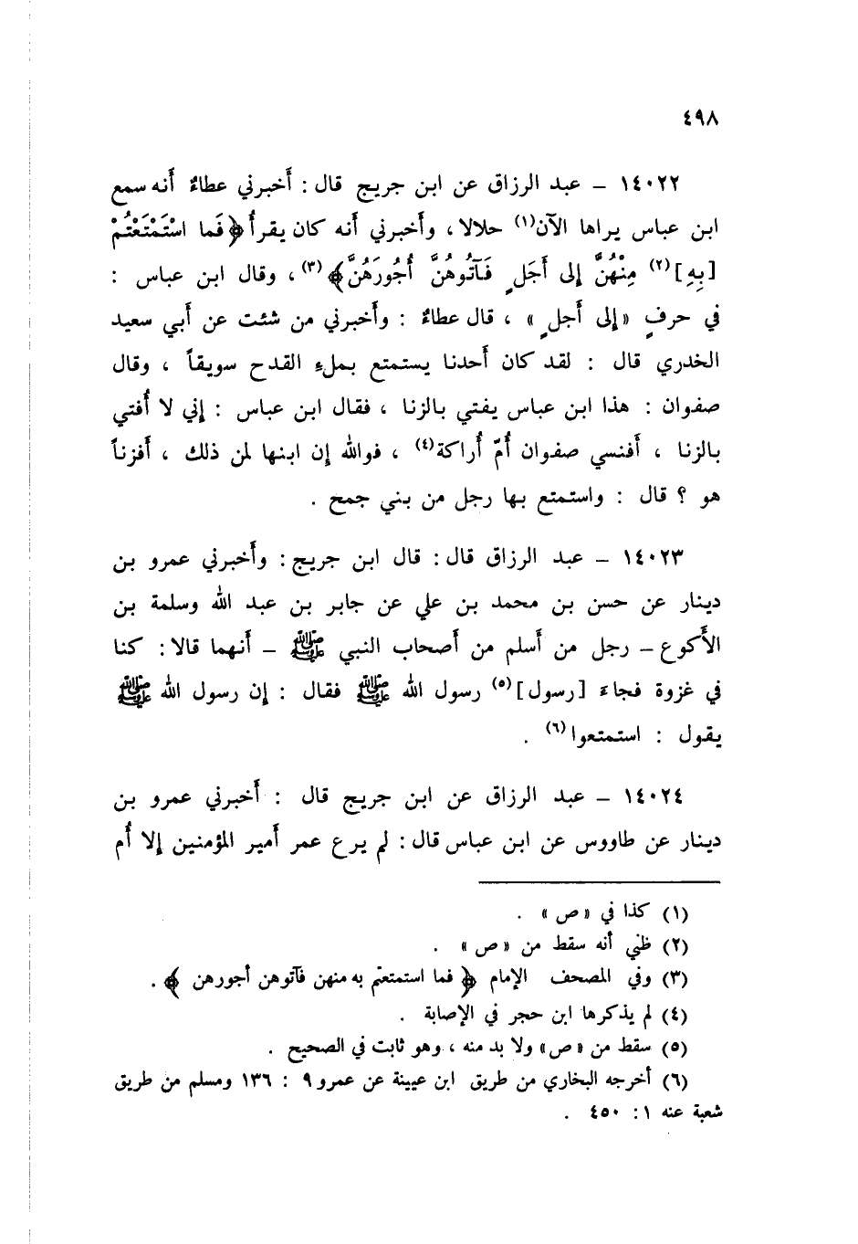 14024 - عَبْدُ الرَّزَّاقِ، عَنِ ابْنِ جُرَيْجٍ قَالَ: أَخْبَرَنِي عَمْرُو بْنُ دِينَارٍ، عَنْ طَاوُسٍ، عَنِ ابْنِ عَبَّاسٍ قَالَ: " §لَمْ يُرَعْ عُمَرُ أَمِيرُ الْمُؤْمِنِينَ إِلَّا أُمَّ أَرَاكَةَ، قَدْ خَرَجَتْ حُبْلَى فَسَأَلَهَا عُمَرُ عَنْ حَمْلِهَا؟ فَقَالَتِ: اسْتَمْتَعَ بِي سَلَمَةُ بْنُ أُمَيَّةَ بْنِ خَلَفٍ، فَلَمَّا أَنْكَرَ صَفْوَانُ عَلَى ابْنِ عَبَّاسٍ بَعْضَ مَا يَقُولُ فِي ذَلِكَ " قَالَ: «فَسَلْ عَمَّكَ هَلِ اسْتَمْتَعَ»