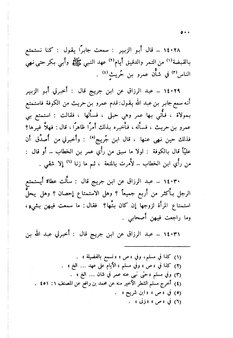 14031 - عَنِ ابْنِ جُرَيْجٍ قَالَ: أَخْبَرَنِي عَبْدُ اللَّهِ بْنُ عُثْمَانَ بْنِ خُثَيْمٍ، أَنَّ مُحَمَّدَ بْنَ الْأَسْوَدِ بْنِ خَلَفٍ أَخْبَرَهُ، أَنَّ عَمْرَو بْنَ حَوْشَبٍ اسْتَمْتَعَ بِجَارِيَةٍ بِكْرٍ مِنْ بَنِي عَامِرِ بْنِ لُؤَيٍّ، فَحَمَلَتْ، فَذُكِرَ ذَلِكَ لِعُمَرَ فَسَأَلَهَا؟ فَقَالَتِ: اسْتَمْتَعَ مِنْهَا عَمْرُو بْنُ حَوْشَبٍ فَسَأَلَهُ؟ فَاعْتَرَفَ، فَقَالَ عُمَرُ: «مَنْ أَشْهَدْتَ؟» قَالَ: - لَا أَدْرِي أَقَالَ: أُمَّهَا، أَوْ أُخْتَهَا، أَوْ أَخَاهَا وَأُمَّهَا، فَقَامَ عُمَرُ عَلَى الْمِنْبَرِ، فَقَالَ: «§مَا بَالُ رِجَالٍ يَعْمَلُونَ بِالْمُتْعَةِ وَلَا يُشْهِدُونَ عُدُولًا، وَلَمْ يُبَيِّنْهَا إِلَّا حَدَدَتْهُ». قَالَ: أَخْبَرَنِي هَذَا الْقَوْلَ عَنْ عُمَرَ مَنْ كَانَ تَحْتَ مِنْبَرِهِ سَمِعَهُ حِينَ يَقُولُهُ قَالَ: «فَتَلَقَّاهُ النَّاسُ مِنْهُ»