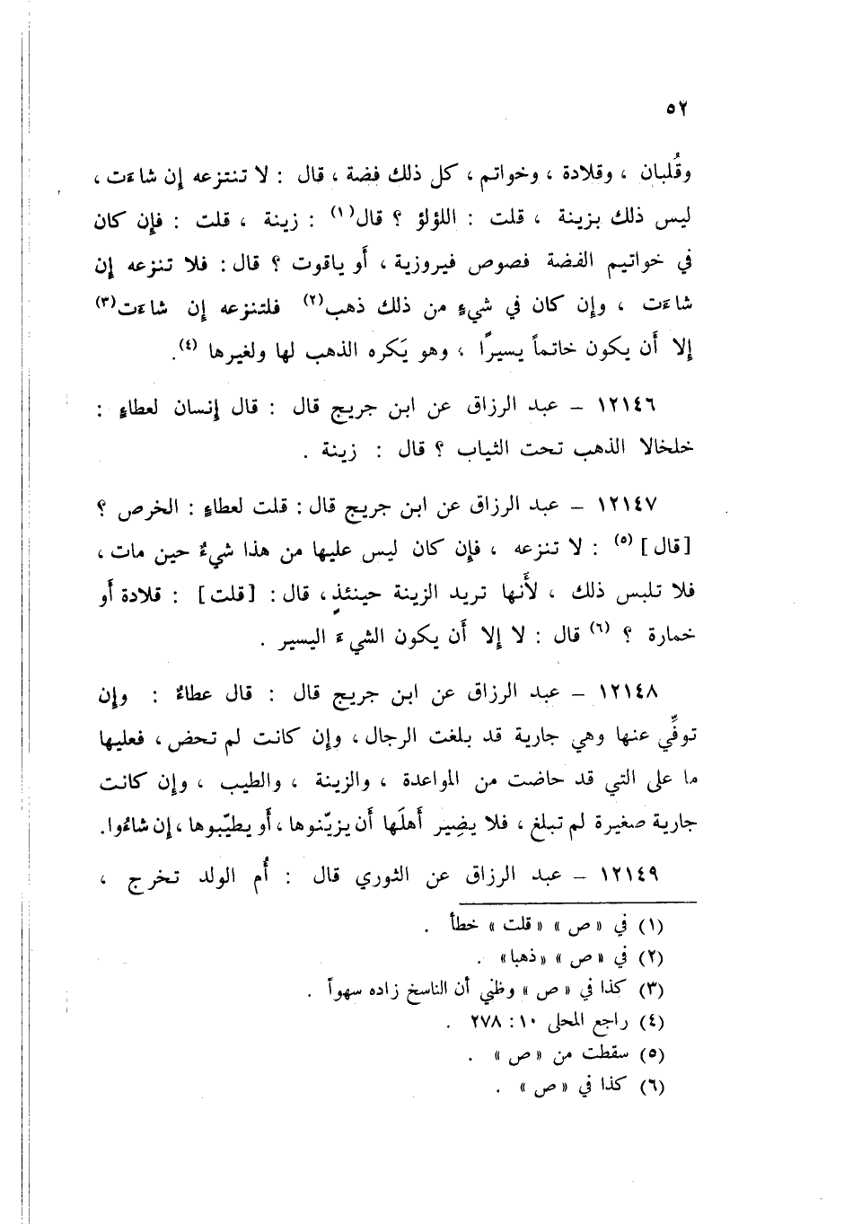 12147 - عَنِ ابْنِ جُرَيْجٍ قَالَ: قُلْتُ لِعَطَاءٍ: §الْخُرْصُ؟ قَالَ: «لَا تَنْزِعُهُ، فَإِنْ كَانَ لَيْسَ عَلَيْهَا مِنْ هَذَا شَيْءٌ حِينَ مَاتَ، فَلَا تَلْبَسُ ذَلِكَ، لِأَنَّهَا تُرِيدُ الزِّينَةَ حِينَئِذٍ» قَالَ: قُلْتُ: قِلَادَةٌ أَوْ خِمَارَةٌ؟ قَالَ: «لَا، إِلَّا أَنْ يَكُونَ الشَّيْءَ الْيَسِيرَ»