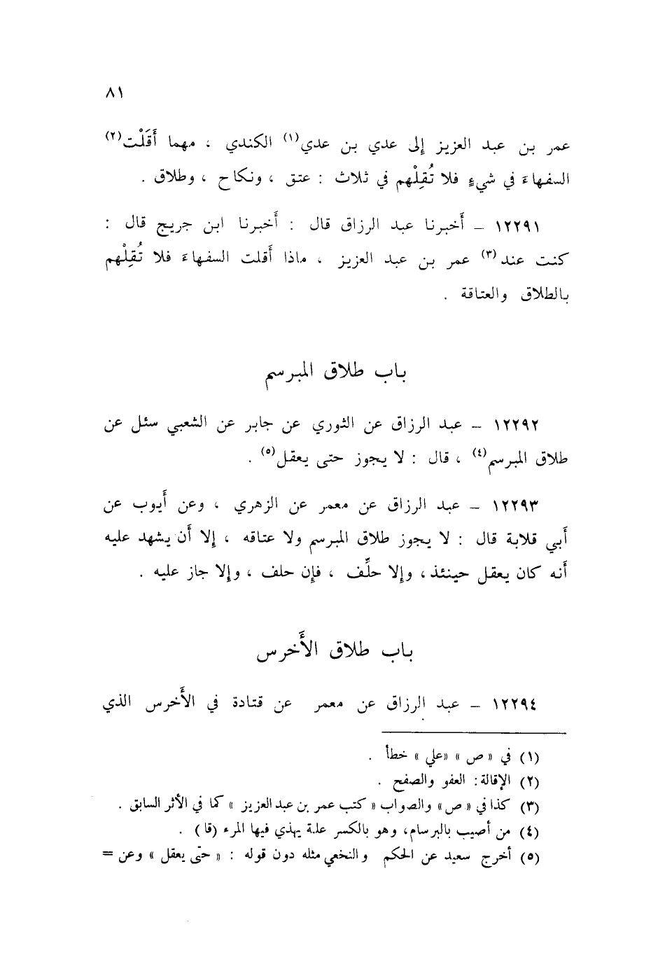 12293 - عَنْ مَعْمَرٍ، عَنِ الزُّهْرِيِّ، وَعَنْ أَيُّوبَ، عَنْ أَبِي قِلَابَةَ قَالَ: «§لَا يَجُوزُ طَلَاقُ الْمُبَرْسَمِ، وَلَا عَتَاقُهُ إِلَّا أَنْ يُشْهَدَ عَلَيْهِ أَنَّهُ كَانَ يَعْقِلُ حِينَئِذٍ، وَإِلَّا حُلِّفَ فَإِنْ حَلَفَ وَإِلَّا جَازَ عَلَيْهِ»