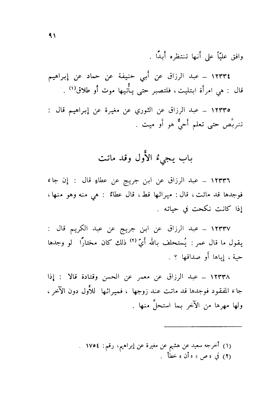 12335 - عَنِ الثَّوْرِيِّ، عَنْ مُغِيرَةَ، عَنْ إِبْرَاهِيمَ قَالَ: «§تَتَرَبَّصُ حَتَّى تَعْلَمَ أَحَيٌّ هُوَ، أَوْ مَيِّتٌ»