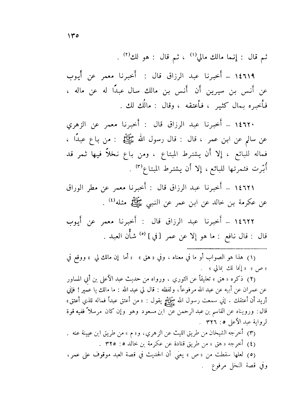 14620 - عَبْدُ الرَّزَّاقِ قَالَ: أَخْبَرَنَا مَعْمَرٌ، عَنِ الزُّهْرِيِّ، عَنْ سَالِمٍ، عَنِ ابْنِ عُمَرَ قَالَ: قَالَ رَسُولُ اللَّهِ صَلَّى اللهُ عَلَيْهِ وَسَلَّمَ: «§مَنْ بَاعَ عَبْدًا، فَمَالُهُ لِلْبَائِعِ إِلَّا أَنْ يَشْتَرِطَ الْمُبْتَاعُ، وَمَنْ بَاعَ نَخْلًا فِيهَا ثَمَرٌ قَدْ أُبِّرَتْ، فَثَمَرَتُهَا لِلْبَائِعِ إِلَّا أَنْ يَشْتَرِطَ الْمُبْتَاعُ»، أَخْبَرَنَا