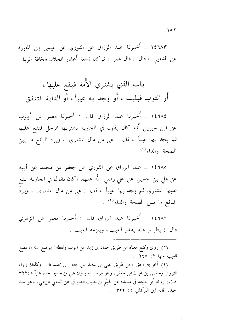 14685 - عَنِ الثَّوْرِيِّ، عَنْ جَعْفَرِ بْنِ مُحَمَّدٍ، عَنْ أَبِيهِ، عَنْ عَلِيِّ بْنِ حُسَيْنٍ، عَنْ عَلِيٍّ رَضِيَ اللَّهُ عَنْهُمَا، كَانَ يَقُولُ فِي §الْجَارِيَةِ يَقَعُ عَلَيْهَا الْمُشْتَرِي، ثُمَّ يَجِدُ بِهَا عَيْبًا قَالَ: «هِيَ مِنْ مَالِ الْمُشْتَرِي، وَيَرُدُّ الْبَائِعُ مَا بَيْنَ الصِّحَّةِ وَالدَّاءِ»