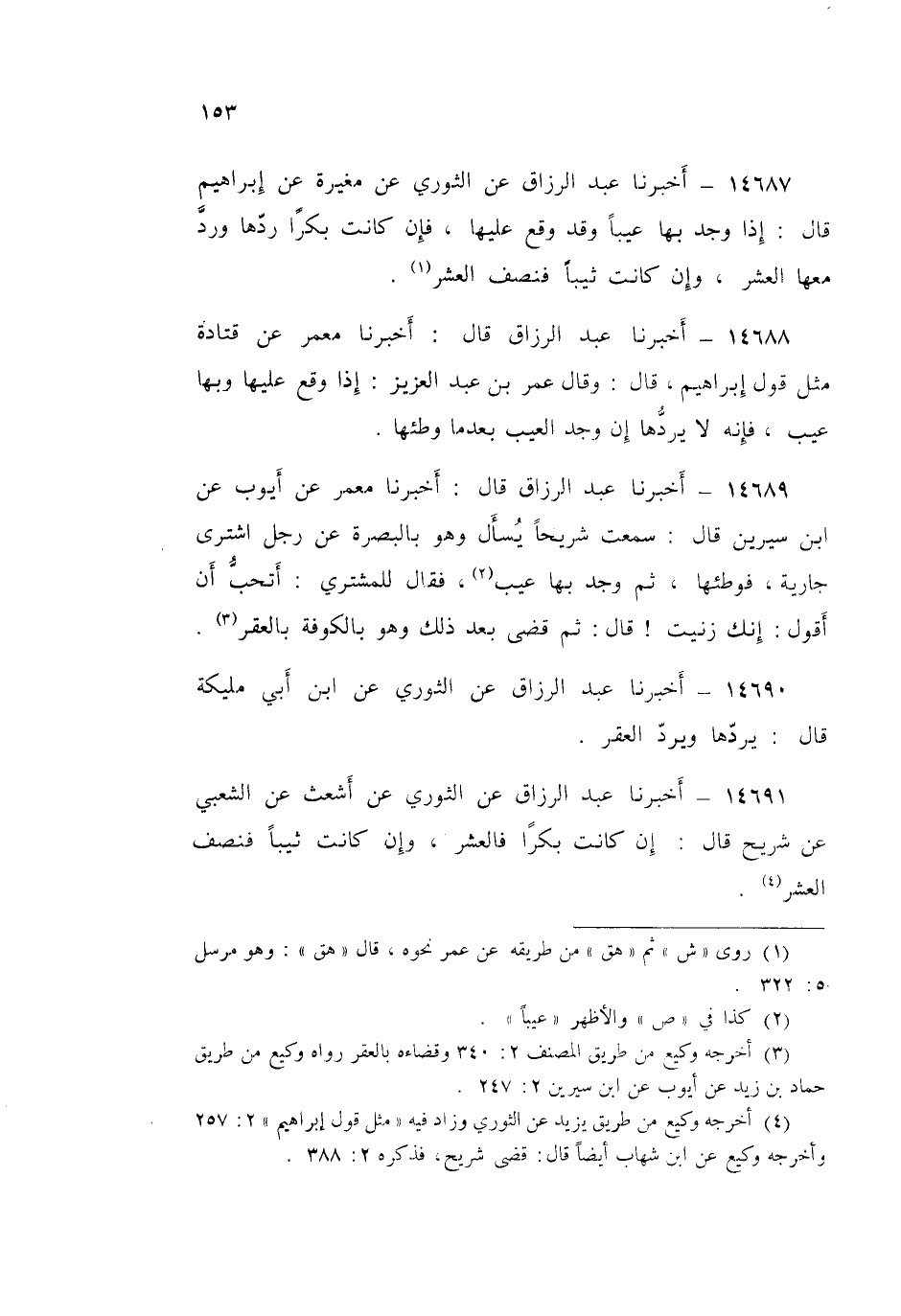 14689 - عَبْدُ الرَّزَّاقِ قَالَ: أَخْبَرَنَا مَعْمَرٌ، عَنْ أَيُّوبَ، عَنِ ابْنِ سِيرِينَ قَالَ: سَمِعْتُ شُرَيْحًا يُسْأَلُ، وَهُوَ بِالْبَصْرَةِ عَنِ §رَجُلٍ اشْتَرَى جَارِيَةً فَوَطِئَهَا، ثُمَّ وَجَدَ بِهَا عَيْبًا، فَقَالَ لِلْمُشْتَرِي: «أَتُحِبُّ أَنْ أَقُولَ إِنَّكَ زَنَيْتَ؟» قَالَ: ثُمَّ قَضَى بَعْدَ ذَلِكَ، وَهُوَ بِالْكُوفَةِ بِالْعُقْرِ