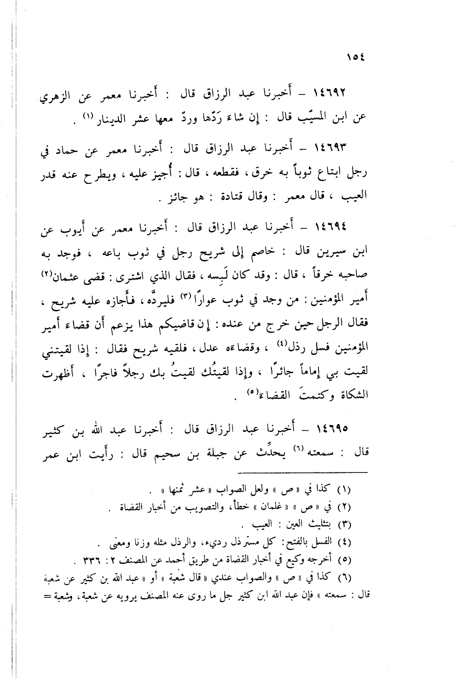 14694 - عَبْدُ الرَّزَّاقِ قَالَ: أَخْبَرَنَا مَعْمَرٌ، عَنْ أَيُّوبَ، عَنِ ابْنِ سِيرِينَ قَالَ: خَاصَمَ إِلَى شُرَيْحٍ رَجُلٌ فِي ثَوْبٍ بَاعَهُ، فَوَجَدَ بِهِ صَاحِبُهُ خَرْقًا قَالَ: وَقَدْ كَانَ لَبِسَهُ، فَقَالَ الَّذِي اشْتَرَى: قَضَى عُثْمَانُ أَمِيرُ الْمُؤْمِنِينَ: «§مَنْ وَجَدَ فِي ثَوْبٍ عَوَارًا، فَلْيَرُدَّهُ» فَأَجَازَهُ عَلَيْهِ شُرَيْحٌ فَقَالَ الرَّجُلُ حِينَ خَرَجَ مِنْ عِنْدِهِ: إِنَّ قَاضِيَكُمْ هَذَا يَزْعُمُ أَنَّ قَضَاءَ أَمِيرِ الْمُؤْمِنِينَ فَسْلٌ رَذْلٌ، وَقَضَاءَهُ عَدْلٌ، فَلَقِيَهُ شُرَيْحٌ فَقَالَ: «إِذَا لَقِيتَنِي لَقِيتَ بِي إِمَامًا جَائِرًا، وَإِذَا لَقِيتُكَ لَقِيتُ بِكَ رَجُلًا فَاجِرًا، أَظْهَرْتَ الشِّكَاةَ، وَكَتَمْتَ الْقَضَاءَ»