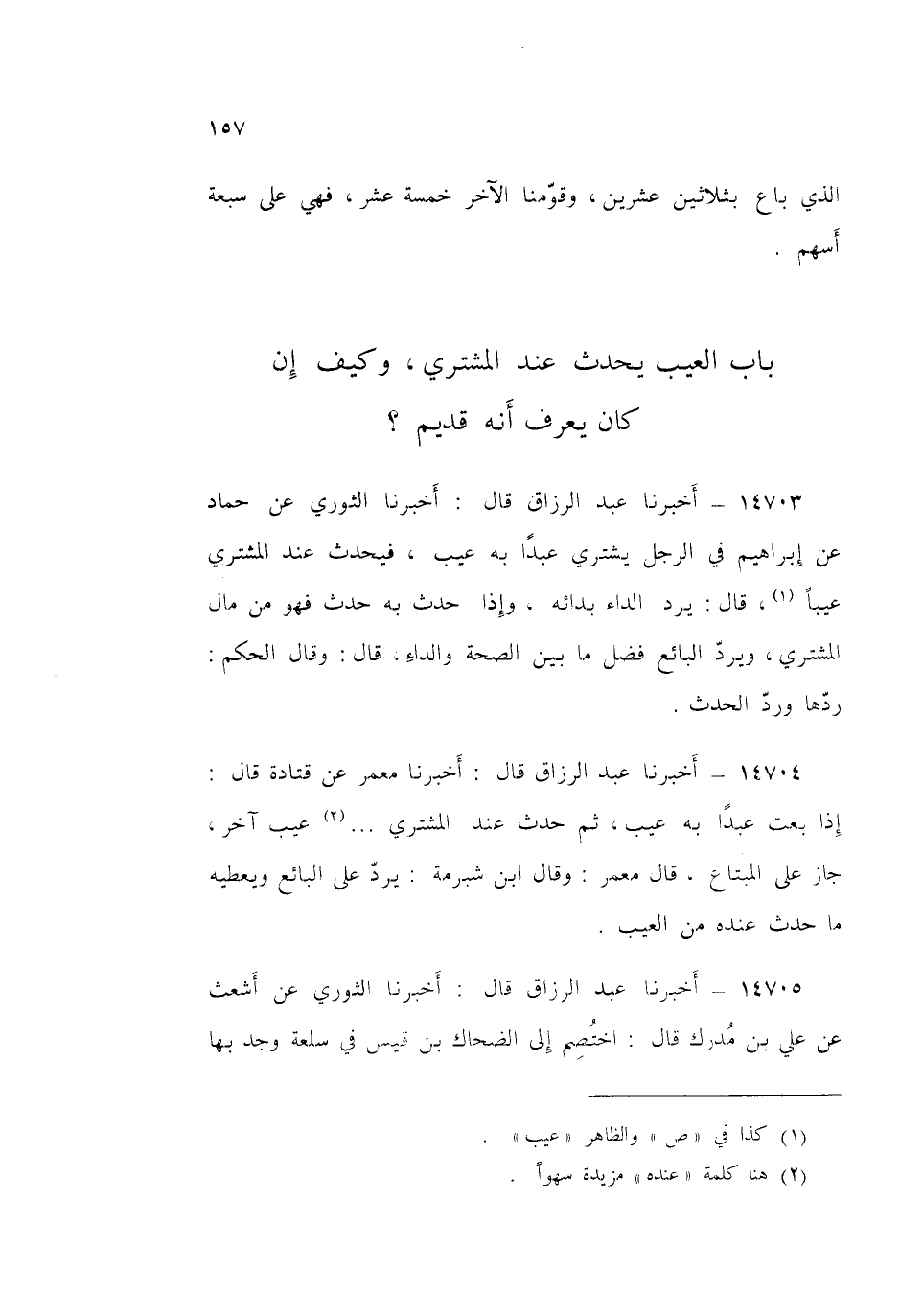 14704 - عَبْدُ الرَّزَّاقِ قَالَ: أَخْبَرَنَا مَعْمَرٌ، عَنْ قَتَادَةَ قَالَ: «§إِذَا بِعْتَ عَبْدًا بِهِ عَيْبٌ، ثُمَّ حَدَثَ عِنْدَ الْمُشْتَرِي. . . عَيْبٌ آخَرُ، جَازَ عَلَى الْمُبْتَاعِ» قَالَ مَعْمَرٌ: وَقَالَ ابْنُ شُبْرُمَةَ: «يَرُدُّ عَلَى الْبَائِعِ وَيُعْطِيهِ مَا حَدَثَ عِنْدَهُ مِنَ الْعَيْبِ»
