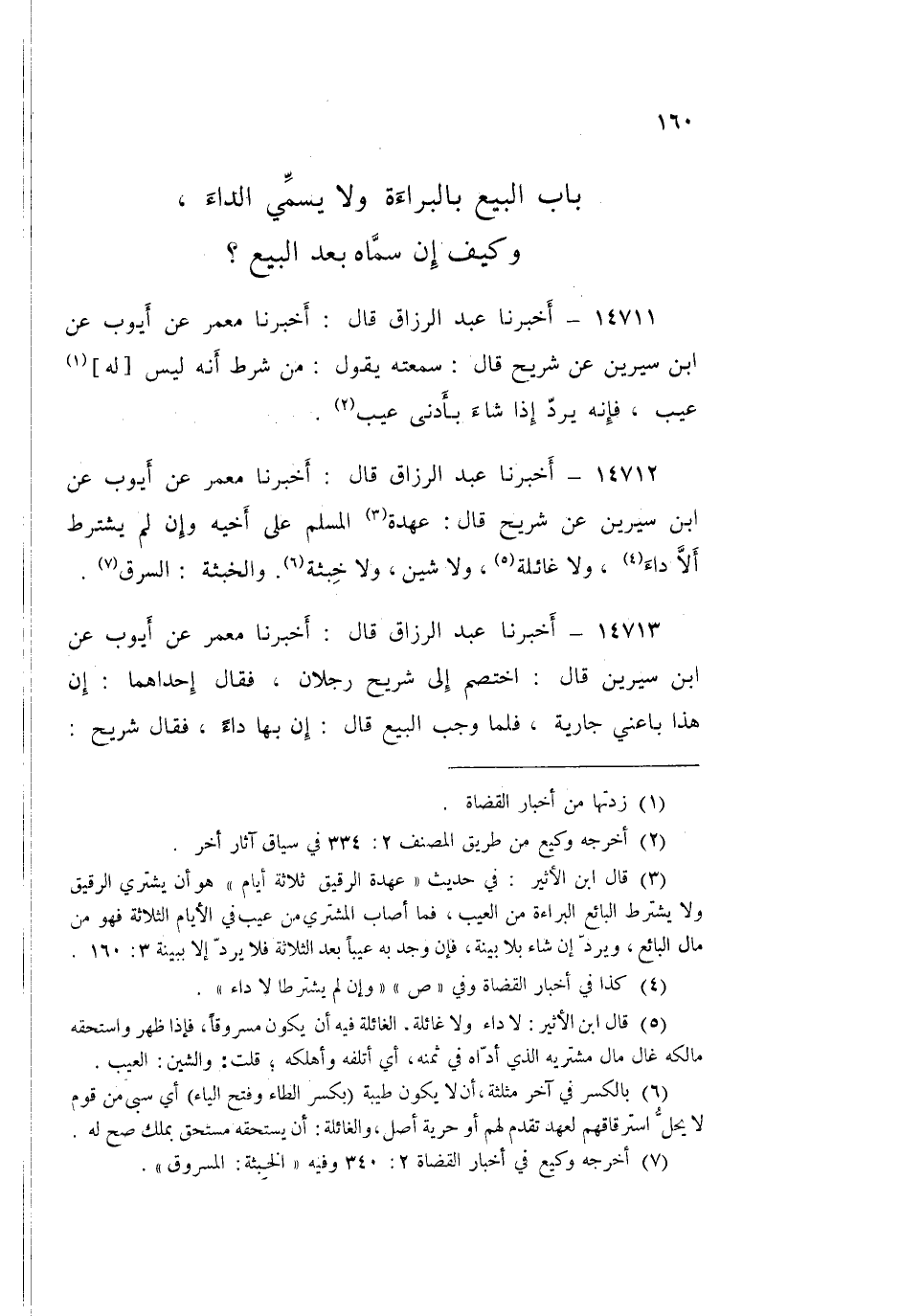 14712 - عَبْدُ الرَّزَّاقِ قَالَ: أَخْبَرَنَا مَعْمَرٌ، عَنْ أَيُّوبَ، عَنِ ابْنِ سِيرِينَ، عَنْ شُرَيْحٍ قَالَ: «§عُهْدَةُ الْمُسْلِمِ عَلَى أَخِيهِ وَإِنْ لَمْ يَشْتَرِطْ أَلَّا دَاءَ، وَلَا غَائِلَةَ، وَلَا شَيْنَ، وَلَا خِبْثَةَ» وَالْخِبْثَةُ: السَّرِقُ