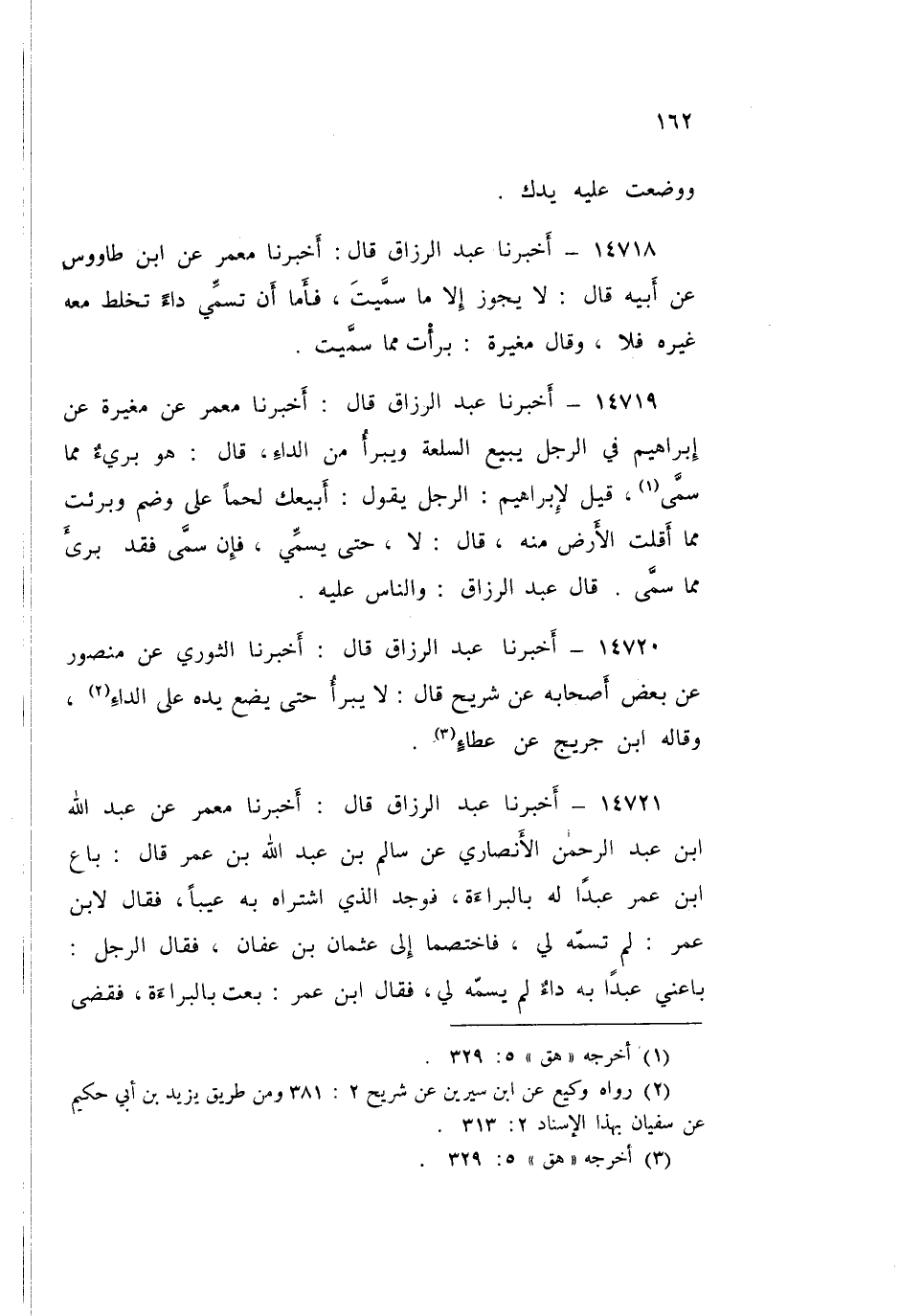 14719 - عَبْدُ الرَّزَّاقِ قَالَ: أَخْبَرَنَا مَعْمَرٌ، عَنْ مُغِيرَةَ، عَنْ إِبْرَاهِيمَ فِي §الرَّجُلِ يَبِيعُ السِّلْعَةَ، وَيَبْرَأُ مِنَ الدَّاءِ قَالَ: «هُوَ بَرِيءٌ مِمَّا سَمَّى»، قِيلَ لِإِبْرَاهِيمَ: الرَّجُلُ يَقُولُ: أَبِيعُكَ لَحْمًا عَلَى وَضْمٍ، وَبَرِئْتُ مِمَّا أَقَلَّتِ الْأَرْضُ مِنْهُ قَالَ: «لَا، حَتَّى يُسَمِّيَ فَإِنْ سَمَّى فَقَدْ بَرِئَ مِمَّا سَمَّى» قَالَ عَبْدُ الرَّزَّاقِ: «وَالنَّاسُ عَلَيْهِ»