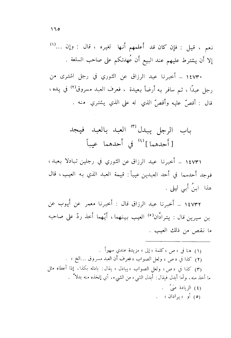 14731 - أَخْبَرَنَا عَبْدُ الرَّزَّاقِ، عَنِ الثَّوْرِيِّ، §فِي رَجُلَيْنِ تَبَادَلَا بِعَبْدٍ فَوَجَدَ أَحَدُهُمَا فِي أَحْدِ الْعَبْدَيْنِ عَيْبًا: «قِيمَةُ الْعَبْدِ الَّذِي بِهِ الْعَيْبِ» قَالَ هَذَا ابْنُ أَبِي لَيْلَى