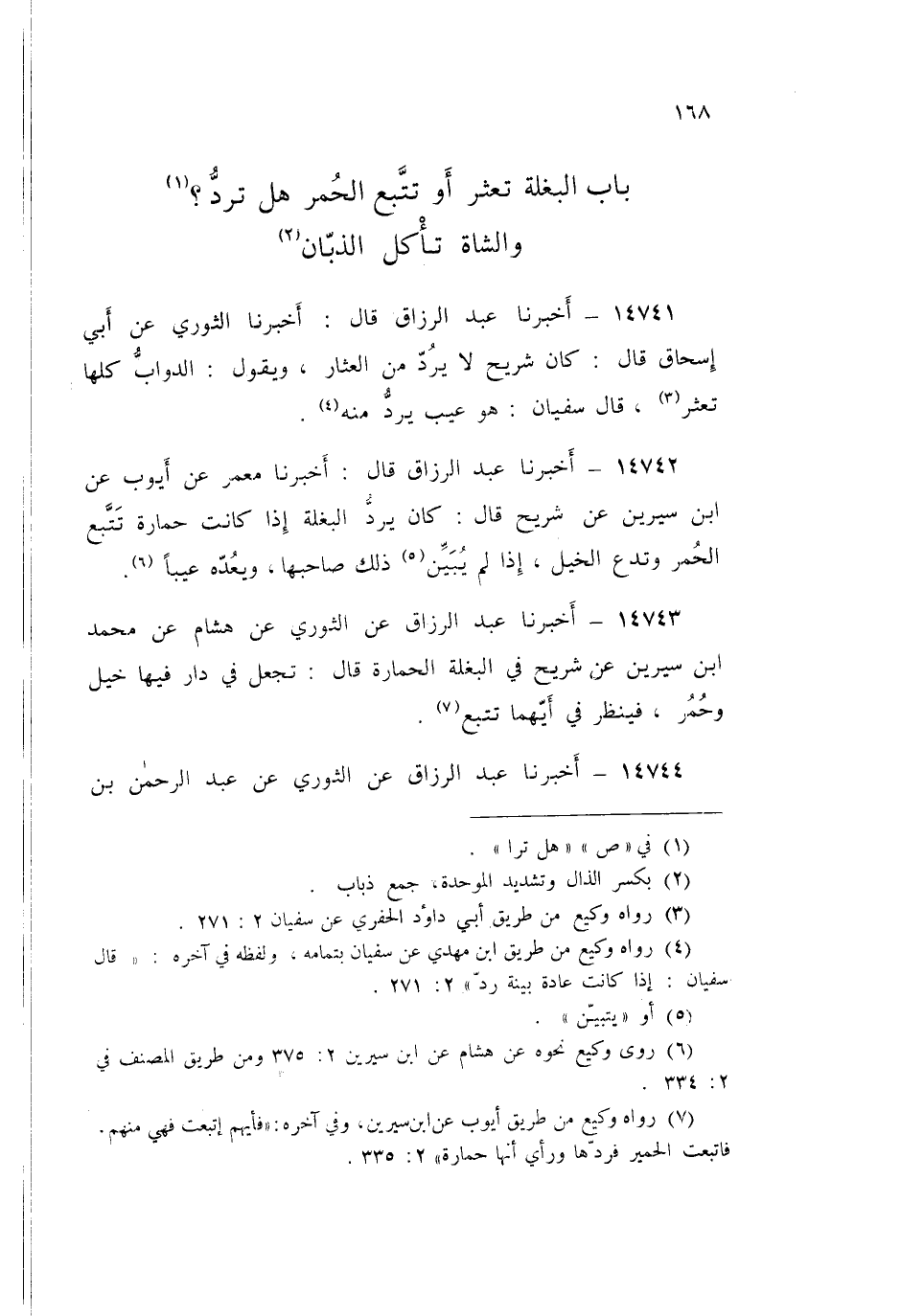 14742 - عَبْدُ الرَّزَّاقِ قَالَ: أَخْبَرَنَا مَعْمَرٌ، عَنْ أَيُّوبَ، عَنِ ابْنِ سِيرِينَ، عَنْ شُرَيْحٍ قَالَ: «كَانَ §يَرُدُّ الْبَغْلَةَ إِذَا كَانَتْ حِمَارَةٌ تَتَّبِعُ الْحُمُرَ، وَتَدَعُ الْخَيْلَ إِذَا لَمْ يُبَيِّنْ ذَلِكَ صَاحِبُهَا وَيُعِدُّهُ عَيْبًا»