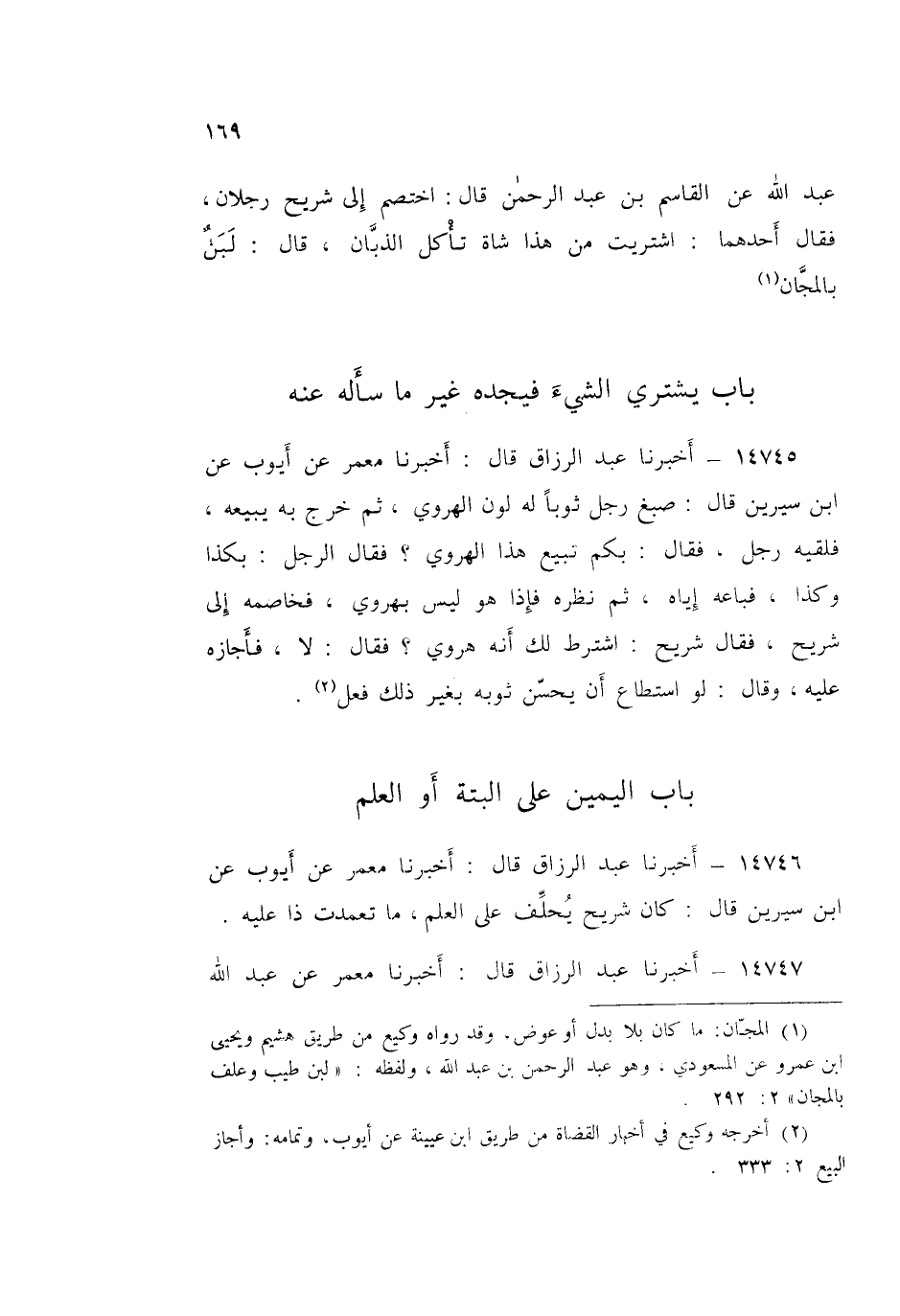14745 - عَبْدُ الرَّزَّاقِ قَالَ: أَخْبَرَنَا مَعْمَرٌ، عَنْ أَيُّوبَ، عَنِ ابْنِ سِيرِينَ قَالَ: صَبَغَ رَجُلٌ ثَوْبًا لَهُ لَوْنُ الْهَرَوِي ثُمَّ خَرَجَ بِهِ يَبِيعُهُ، فَلَقِيَهُ رَجُلٌ فَقَالَ: بِكُمْ تَبِيعُ هَذَا الْهَرَوِيَّ؟ فَقَالَ الرَّجُلُ: بِكَذَا وَكَذَا، فَبَاعَهُ إِيَّاهُ ثُمَّ نَظَرَهُ، فَإِذَا هُوَ لَيْسَ بِهَرَوِيٍّ فَخَاصَمَهُ إِلَى شُرَيْحٍ، فَقَالَ شُرَيْحٌ: «§اشْتَرَطَ لَكَ أَنَّهُ هَرَوِيٌّ؟» فَقَالَ: لَا، فَأَجَازَهُ عَلَيْهِ، وَقَالَ: «لَوِ اسْتَطَاعَ أَنْ يُحَسِّنَ ثَوْبَهُ بِغَيْرِ ذَلِكَ فَعَلَ»