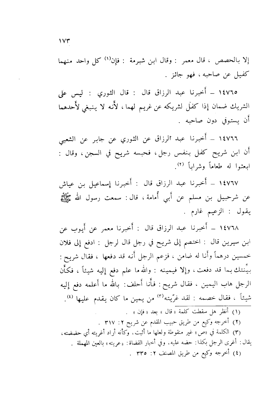 14766 - أَخْبَرَنَا عَبْدُ الرَّزَّاقِ قَالَ: عَنِ الثَّوْرِيِّ، عَنْ جَابِرٍ، عَنِ الشَّعْبِيِّ، أَنَّ ابْنَ شُرَيْحٍ §كَفَلَ بِنَفْسِ رَجُلٍ، فَحَبَسَهُ شُرَيْحٌ فِي السِّجْنِ وَقَالَ: «ابْعَثُوا لَهُ طَعَامًا، وَشَرَابًا»