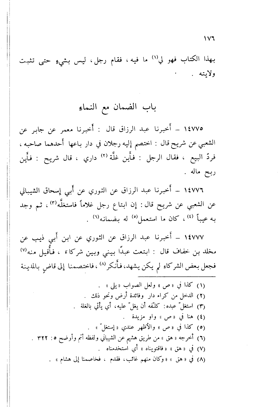 14777 - أَخْبَرَنَا عَبْدُ الرَّزَّاقِ، عَنِ الثَّوْرِيِّ، عَنِ ابْنِ أَبِي ذِئْبٍ، عَنْ مَخْلَدِ بْنِ خَفَّافٍ، قَالَ ابْتَعْتُ عَبْدًا بَيْنِي وَبَيْنَ شُرَكَاءَ، فَأُقِيلَ مِنْهُ، فَجَعَلَ بَعْضُ الشُّرَكَاءِ لَمْ يَكُنْ يَشْهَدُ، فَأَنْكَرَ، فَاخْتَصَمْنَا إِلَى قَاضٍ بِالْمَدِينَةِ يُقَالُ لَهُ هِشَامُ بْنُ إِسْمَاعِيلَ، فَأَمَرَ بِرَدِّ الْغُلَامِ، فَأَتَيْتُ عُرْوَةَ بْنَ الزُّبَيْرِ فَحَدَّثْتُهُ، فَقَامَ مَعِي إِلَيْهِ فَقَالَ عُرْوَةُ: حَدَّثَتْنِي عَائِشَةُ أُمُّ الْمُؤْمِنِينَ رَضِيَ اللَّهُ عَنْهَا، أَنَّ رَسُولَ اللَّهِ صَلَّى اللهُ عَلَيْهِ وَسَلَّمَ قَالَ: «§الْخَرَاجُ بِالضَّمَانِ» قَالَ: فَرَجَعَ عَنْ قَضَائِهِ