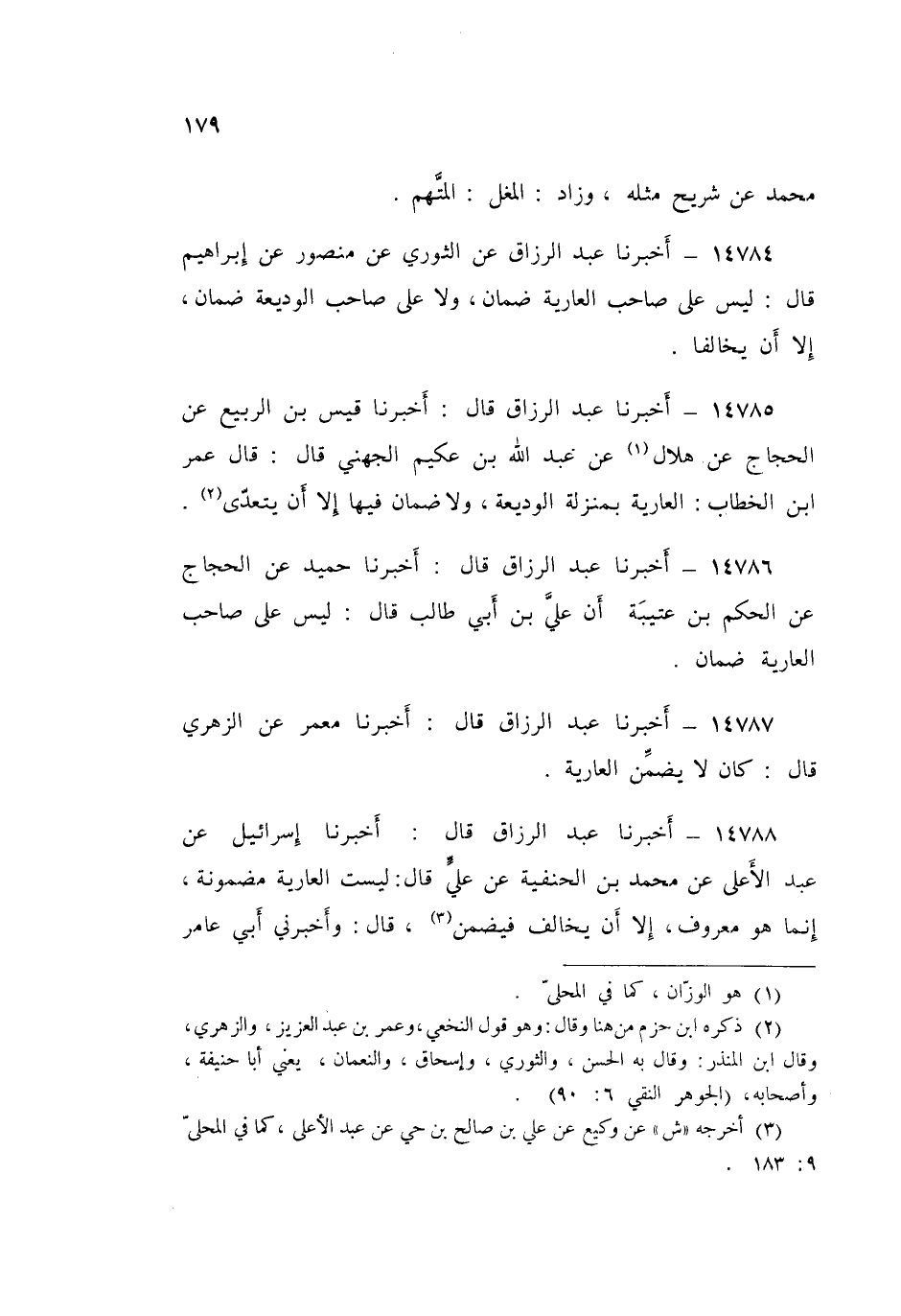 14787 - عَبْدُ الرَّزَّاقِ قَالَ: أَخْبَرَنَا مَعْمَرٌ، عَنِ الزُّهْرِيِّ قَالَ: «كَانَ §لَا يُضَمِّنُ الْعَارِيَةَ»