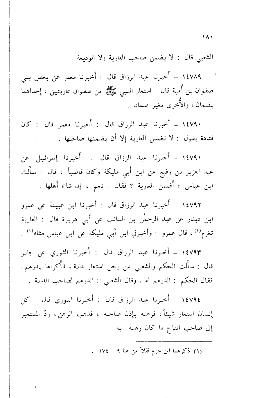 14791 - عَبْدُ الرَّزَّاقِ قَالَ: أَخْبَرَنَا إِسْرَائِيلُ، عَنِ عَبْدِ الْعَزِيزِ بْنِ رُفَيْعٍ، عَنِ ابْنِ أَبِي مُلَيْكَةَ، وَكَانَ قَاضِيًا قَالَ: سَأَلْتُ ابْنَ عَبَّاسٍ: §أَضْمَنُ الْعَارِيَةَ؟ فَقَالَ: «نَعَمْ إِنْ شَاءَ أَهْلُهَا»