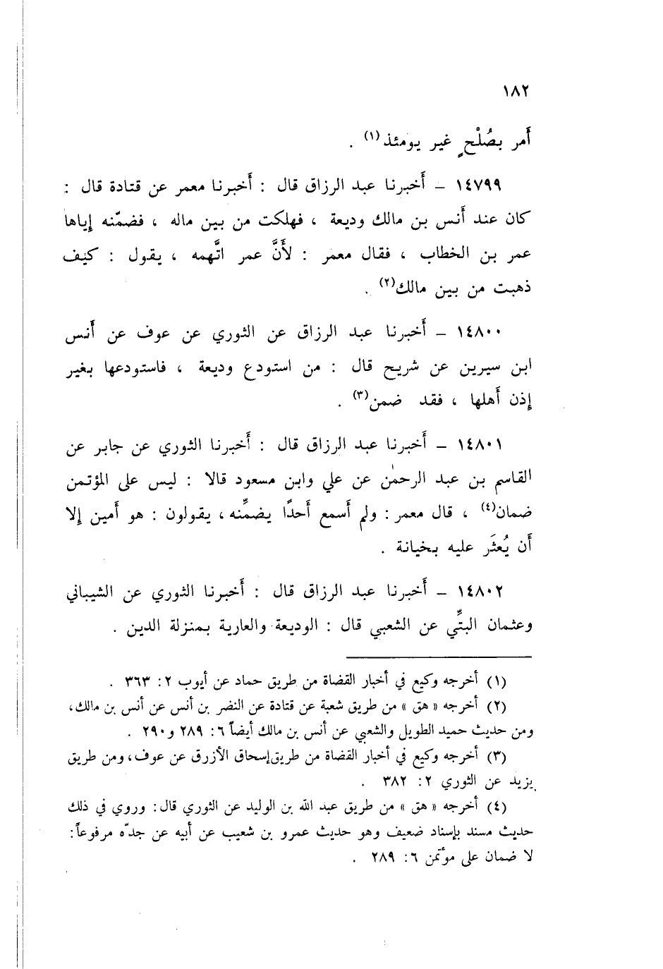 14802 - عَبْدُ الرَّزَّاقِ قَالَ: أَخْبَرَنَا الثَّوْرِيُّ، عَنِ الشَّيْبَانِيِّ، وَعُثْمَانَ الْبَتِّيِّ، عَنِ الشَّعْبِيِّ قَالَ: «§الْوَدِيعَةُ، وَالْعَارِيَةُ بِمَنْزِلَةِ الدَّيْنِ»
