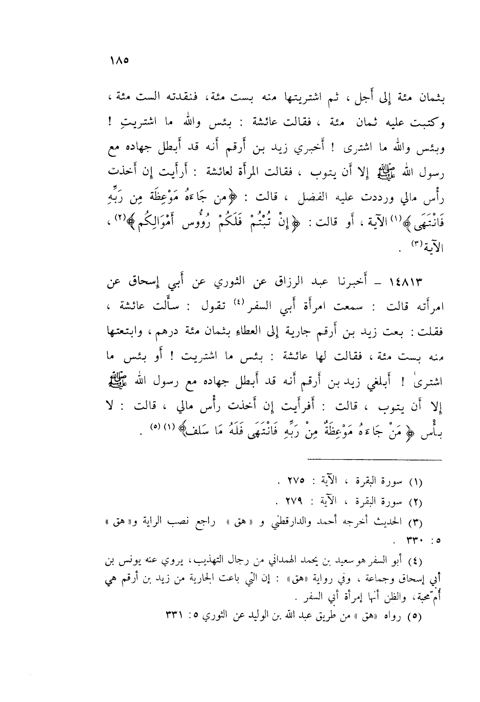 14813 - أَخْبَرَنَا عَبْدُ الرَّزَّاقِ، عَنِ الثَّوْرِيِّ، عَنْ أَبِي إِسْحَاقَ، عَنِ امْرَأَتِهِ قَالَتْ: سَمِعْتُ امْرَأَةَ أَبِي السَّفَرِ، تَقُولُ: سَأَلْتُ عَائِشَةَ فَقُلْتُ: بِعْتُ زَيْدَ بْنَ أَرْقَمَ جَارِيَةً إِلَى الْعَطَاءِ بِثَمَانِ مِائَةِ دِرْهَمٍ، وَابْتَعْتُهَا مِنْهُ بِسِتِّ مِائَةٍ، فَقَالَتْ لَهَا عَائِشَةُ: " بِئْسَ مَا اشْتَرَيْتِ، أَوْ بِئْسَ مَا اشْتَرَى، أَبْلِغِي زَيْدَ بْنَ أَرْقَمَ: أَنَّهُ قَدْ أَبْطَلَ جِهَادَهُ مَعَ رَسُولِ اللَّهِ صَلَّى اللهُ عَلَيْهِ وَسَلَّمَ إِلَّا أَنْ يَتُوبَ " قَالَتْ: أَفَرَأَيْتِ إِنْ أَخَذْتُ رَأْسَ مَالِي؟ قَالَتْ: «لَا بَأْسَ، {§مَنْ جَاءَهُ مَوْعِظَةٌ مِنْ رَبِّهِ فَانْتَهَى فَلَهُ مَا سَلَفَ}»