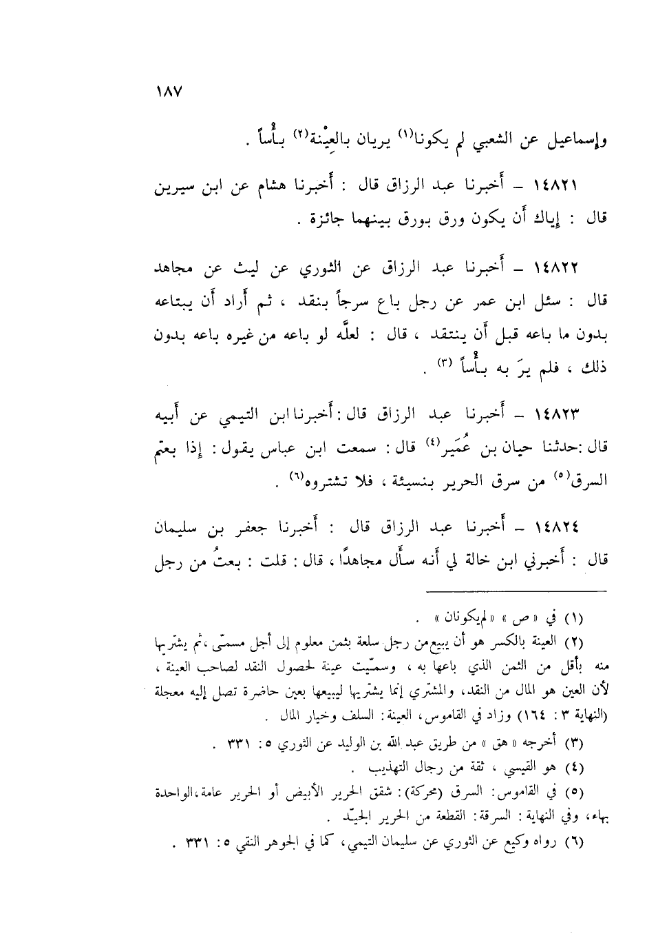 14823 - عَبْدُ الرَّزَّاقِ قَالَ: أَخْبَرَنَا ابْنُ التَّيْمِيِّ، عَنْ أَبِيهِ قَالَ: حَدَّثَنَا حَيَّانُ بْنُ عُمَيْرٍ قَالَ: سَمِعْتُ ابْنَ عَبَّاسٍ يَقُولُ: «§إِذَا بِعْتُمُ السَّرَقَ - مِنْ سَرَقِ الْحَرِيرَ بِنَسِيئَةٍ - فَلَا تَشْتَرُوهُ»