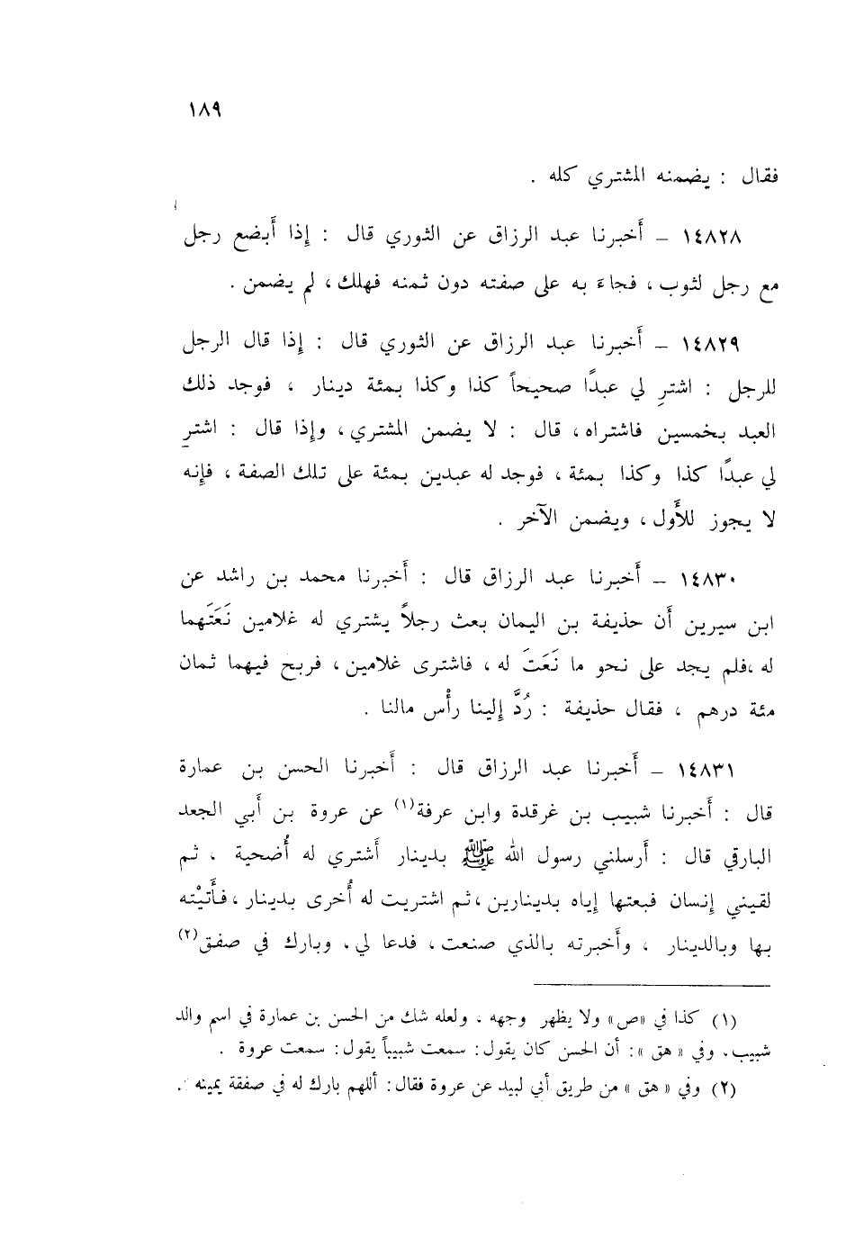 14831 - عَبْدُ الرَّزَّاقِ قَالَ: أَخْبَرَنَا الْحَسَنُ بْنُ عُمَارَةَ قَالَ: أَخْبَرَنَا شَبِيبُ بْنُ غَرْقَدَةَ، وَابْنُ عَرَفَةَ، عَنْ عُرْوَةَ بْنِ أَبِي الْجَعْدِ الْبَارِقِيِّ قَالَ: «§أَرْسَلَنِي رَسُولُ اللَّهِ صَلَّى اللهُ عَلَيْهِ وَسَلَّمَ بِدِينَارٍ أَشْتَرِي لَهُ أُضْحِيَةً، ثُمَّ لَقِيَنِي إِنْسَانٌ، فَبِعْتُهَا إِيَّاهُ بِدِينَارَيْنِ، ثُمَّ اشْتَرَيْتُ لَهُ أُخْرَى بِدِينَارٍ، فَأَتَيْتُهُ بِهَا، وَبَالدِّينَارِ، وَأَخْبَرْتُهُ بِالَّذِي صَنَعْتُ، فَدَعَا لِي وَبَارَكَ فِي صَفْقِ -[190]- يَمِينِي» قَالَ: فَمَا اشْتَرَيْتُ شَيْئًا إِلَّا رَبِحْتُ فِيهِ، قَالَ عَبْدُ الرَّزَّاقِ: وَأَمَّا الثَّوْرِيُّ فَحَدَّثَ، عَنْ أَبِي حُصَيْنٍ، عَنْ شَيْخٍ مِنْ أَهْلِ الْمَدِينَةِ، عَنْ حَكِيمِ بْنِ حِزَامٍ، أَنَّ النَّبِيَّ صَلَّى اللهُ عَلَيْهِ وَسَلَّمَ بَعَثَهُ لِيَشْتَرِيَ لَهُ أُضْحِيَةً، ثُمَّ يَذْكُرُ مِثْلَ حَدِيثِ عُرْوَةَ بْنِ أَبِي الْجَعْدِ، إِلَّا أَنَّ حَكِيمًا قَالَ: «تَصَدَّقَ النَّبِيُّ صَلَّى اللهُ عَلَيْهِ وَسَلَّمَ بِالدِّينَارِ»
