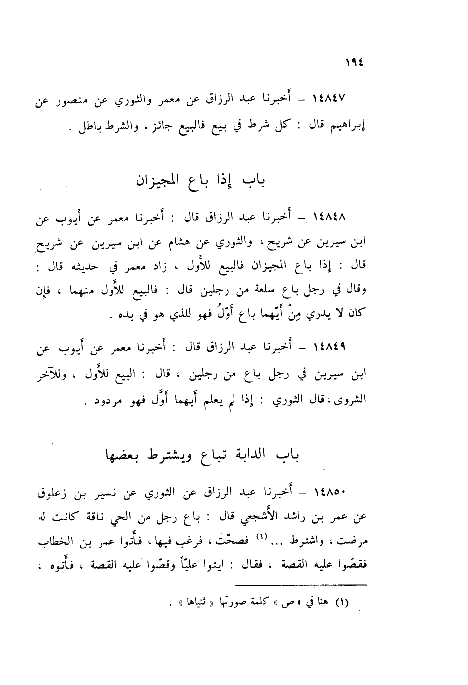 14849 - عَبْدُ الرَّزَّاقِ قَالَ: أَخْبَرَنَا مَعْمَرٌ، عَنْ أَيُّوبَ، عَنِ ابْنِ سِيرِينَ فِي §رَجُلٍ بَاعَ مِنْ رَجُلَيْنِ قَالَ: «الْبَيْعُ لِلْأَوَّلِ، وَلِلْآخِرِ الشَّرْوَى»، قَالَ الثَّوْرِيُّ: «إِذَا لَمْ يَعْلَمْ أَيُّهُمَا أَوَّلُ، فَهُوَ مَرْدُودٌ»