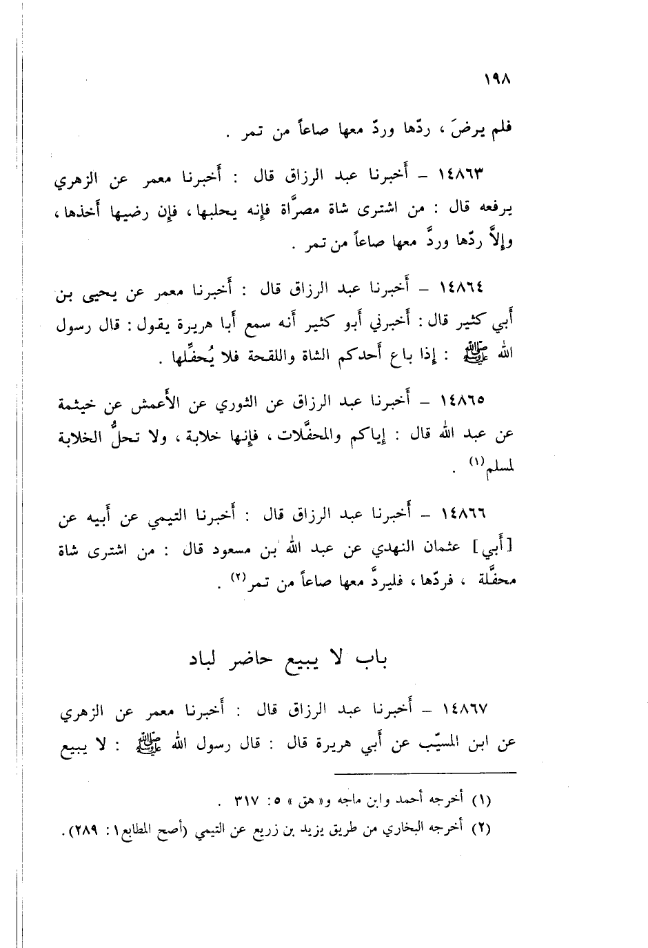 14866 - عَبْدُ الرَّزَّاقِ قَالَ: أَخْبَرَنَا التَّيْمِيُّ، عَنْ أَبِيهِ، عَنْ أَبِي عُثْمَانَ النَّهْدِيِّ، عَنْ عَبْدِ اللَّهِ بْنِ مَسْعُودٍ قَالَ: «§مَنِ اشْتَرَى شَاةً مُحَفَّلَةً فَرَدَّهَا، فَلْيَرُدَّ مَعَهَا صَاعًا مِنْ تَمْرٍ»