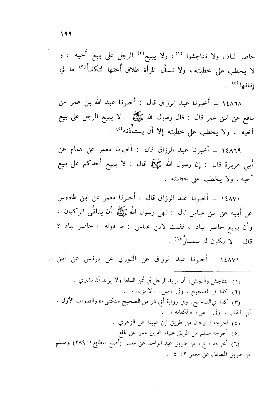 14869 - عَبْدُ الرَّزَّاقِ قَالَ: أَخْبَرَنَا مَعْمَرٌ، عَنْ هَمَّامٍ، عَنْ أَبِي هُرَيْرَةَ قَالَ: إِنَّ رَسُولَ اللَّهِ صَلَّى اللهُ عَلَيْهِ وَسَلَّمَ قَالَ: «§لَا يَبِعْ أَحَدُكُمْ عَلَى بَيْعِ أَخِيهِ، وَلَا يَخْطُبْ عَلَى خِطْبَتِهِ»