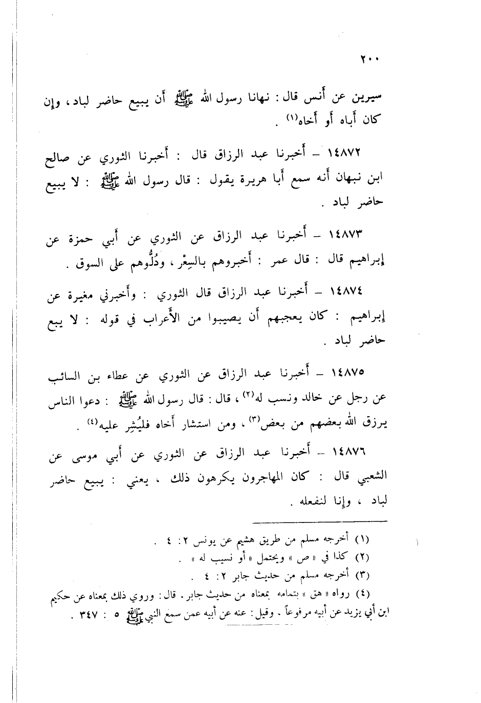 14874 - عَبْدُ الرَّزَّاقِ قَالَ: الثَّوْرِيُّ: وَأَخْبَرَنِي مُغِيرَةُ، عَنْ إِبْرَاهِيمَ كَانَ §يُعْجِبُهُمْ أَنْ يُصِيبُوا مِنَ الْأَعْرَابِ فِي قَوْلِهِ: لَا يَبِعْ حَاضِرٌ لِبَادٍ "