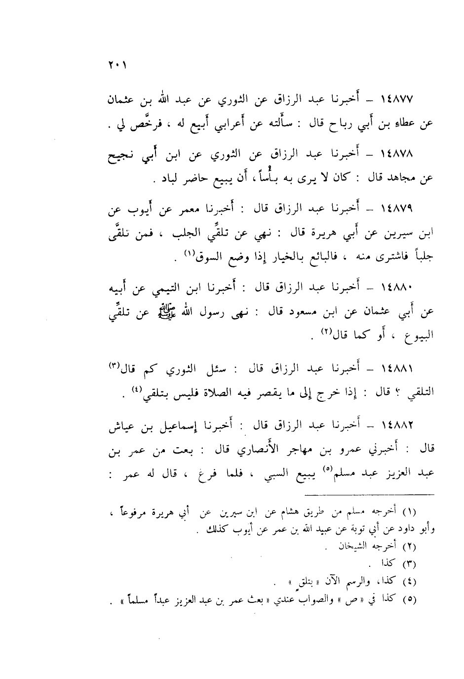 14880 - عَبْدُ الرَّزَّاقِ قَالَ: أَخْبَرَنَا ابْنُ التَّيْمِيِّ، عَنْ أَبِيهِ، عَنْ أَبِي عُثْمَانَ، عَنِ ابْنِ مَسْعُودٍ قَالَ: «§نَهَى رَسُولُ اللَّهِ صَلَّى اللهُ عَلَيْهِ وَسَلَّمَ عَنْ تَلَقِّي الْبُيُوعِ»، أَوْ كَمَا قَالَ