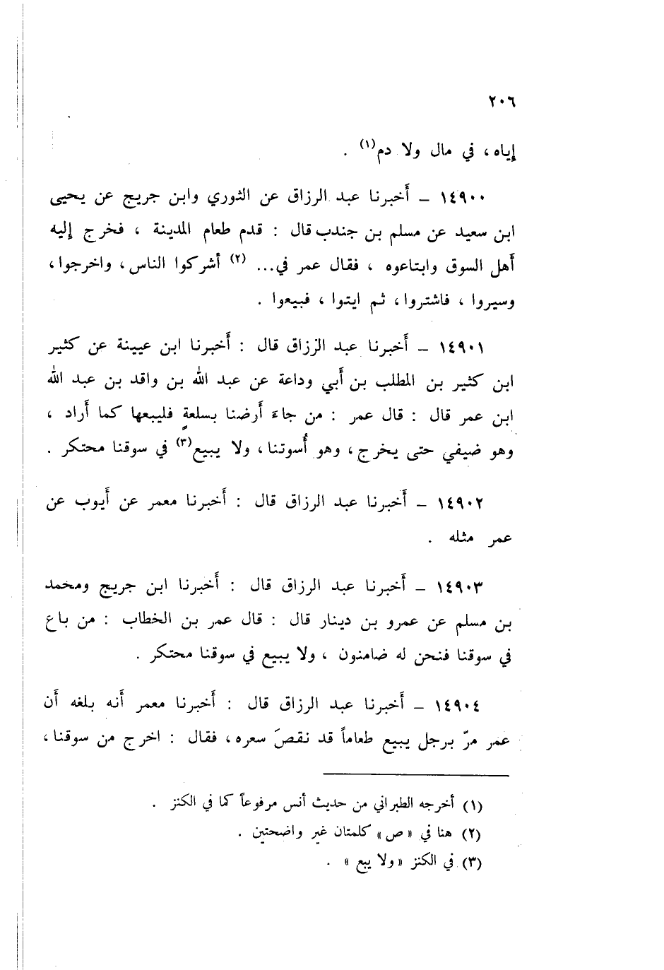 14903 - عَبْدُ الرَّزَّاقِ قَالَ: أَخْبَرَنَا ابْنُ جُرَيْجٍ، وَمُحَمَّدُ بْنُ مُسْلِمٍ، عَنْ عَمْرِو بْنِ دِينَارٍ قَالَ: قَالَ عُمَرُ بْنُ الْخَطَّابِ: «§مَنْ بَاعَ فِي سُوقِنَا فَنَحْنُ لَهُ ضَامِنُونَ، وَلَا يَبِعْ فِي سُوقِنَا مُحْتَكِرٌ»