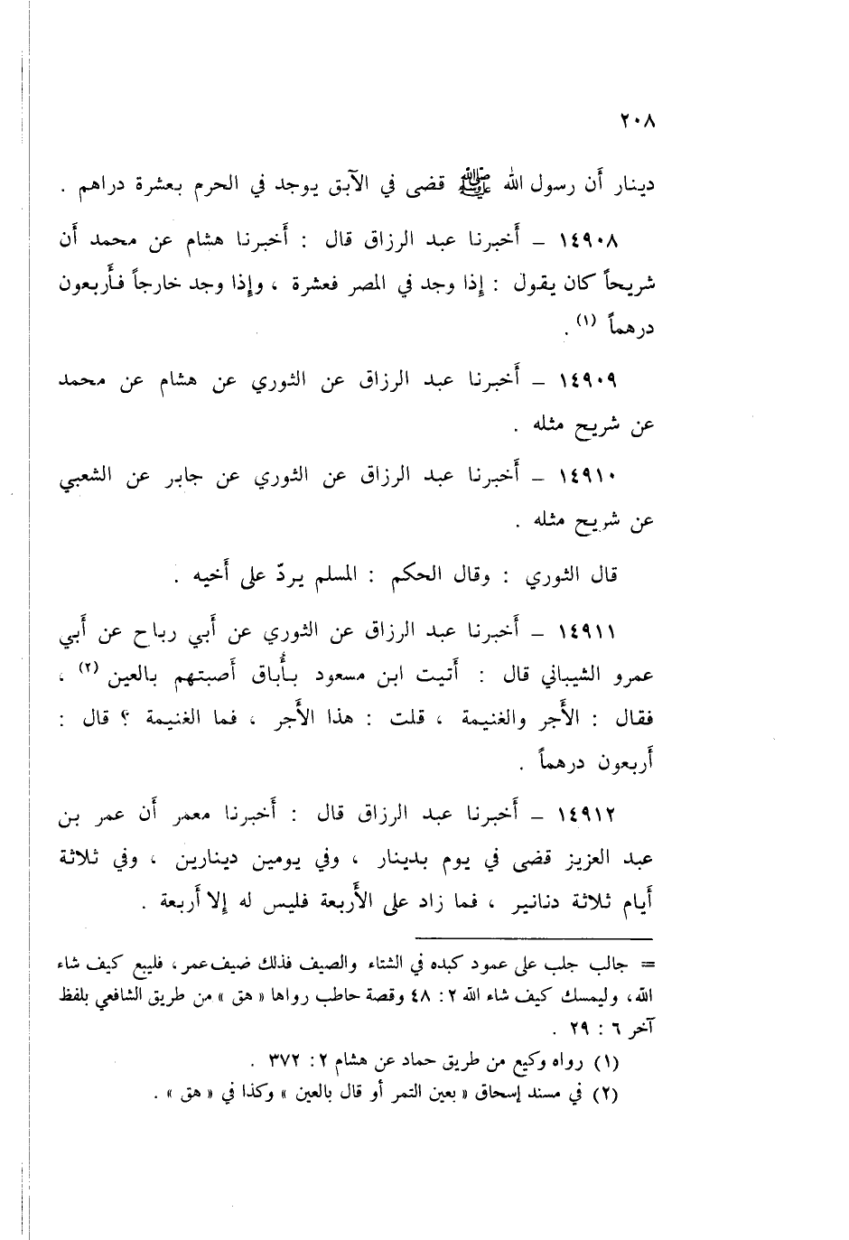14911 - أَخْبَرَنَا عَبْدُ الرَّزَّاقِ، عَنِ الثَّوْرِيِّ، عَنْ أَبِي رَبَاحٍ، عَنْ أَبِي عَمْرٍو الشَّيْبَانِيِّ قَالَ: §أَتَيتُ ابْنَ مَسْعُودٍ بِأُبَاقٍ أَصَبْتُهُمْ بِالْعَيْنِ، فَقَالَ: «الْأَجْرُ وَالْغَنِيمَةُ»، قُلْتُ: هَذَا الْأَجْرُ، فَمَا الْغَنِيمَةُ؟ قَالَ: «أَرْبَعُونَ دِرْهَمًا»