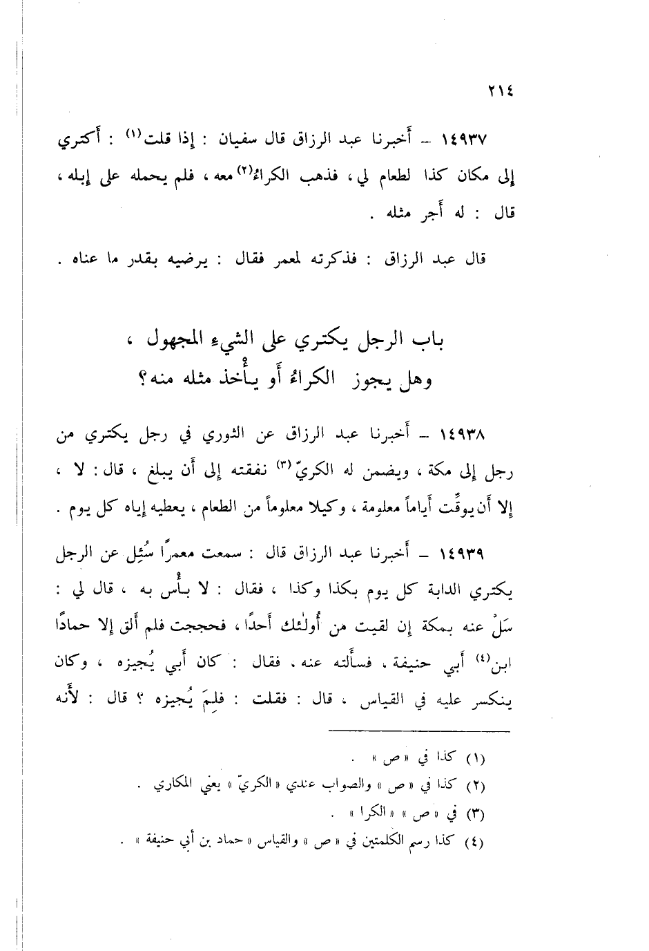 14939 - عَبْدُ الرَّزَّاقِ قَالَ: سَمِعْتُ مَعْمَرًا سُئِلَ عَنِ §الرَّجُلِ يَكْتَرِي الدَّابَّةَ كُلَّ يَوْمٍ بِكَذَا وَكَذَا، فَقَالَ: «لَا بَأْسَ بِهِ»، قَالَ لِي: سَلْ عَنْهُ بِمَكَّةَ إِنْ لَقِيتَ مِنْ أُولَئِكَ أَحَدًا، فَحَجَجْتُ فَلَمْ أَلْقَ إِلَّا حَمَّادَ بْنَ أَبِي حَنِيفَةَ، فَسَأَلْتُهُ عَنْهُ، فَقَالَ: «كَانَ أَبِي يُجِيزُهُ، وَكَانَ يَنْكَسِرُ عَلَيْهِ فِي الْقِيَاسِ» قَالَ: فَقُلْتُ: فَلِمَ يُجِيزُهُ؟ قَالَ: لِأَنَّهُ عَمَلُ النَّاسِ قَالَ: وَقَالَ: إِنَّ مَنْ لَمْ يَدَعِ الْقِيَاسَ فِي مَجْلِسِ الْقَضَاءِ لَمْ يَفْقَهُ