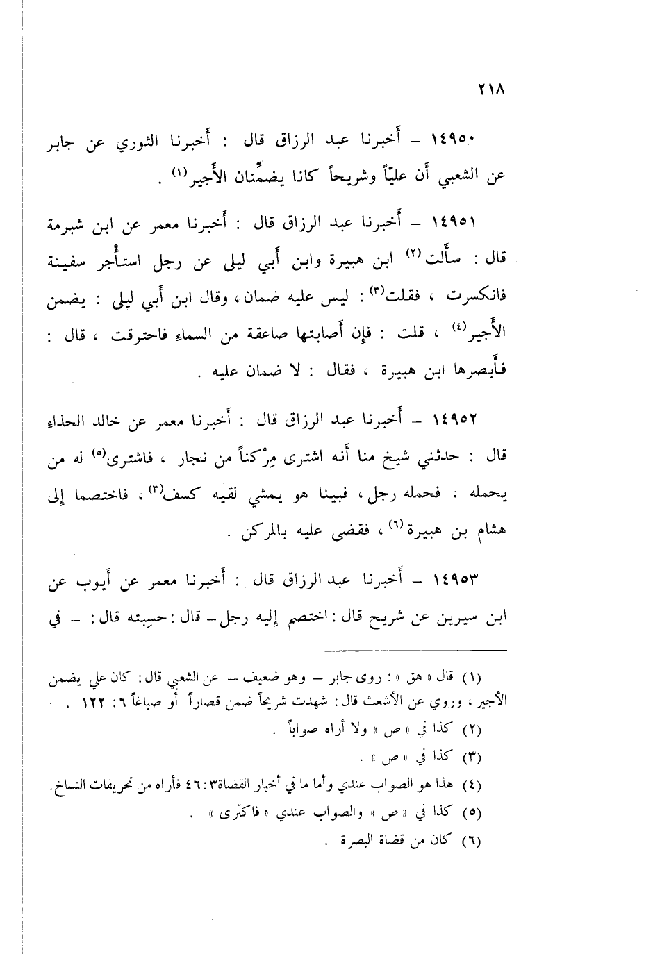 14951 - عَبْدُ الرَّزَّاقِ قَالَ: أَخْبَرَنَا مَعْمَرٌ، عَنِ ابْنِ شُبْرُمَةَ قَالَ: سَأَلْتُ ابْنَ هُبَيْرَةَ، وَابْنَ أَبِي لَيْلَى عَنْ §رَجُلٍ اسْتَأْجَرَ سَفِينَةً، فَانْكَسَرَتْ، فَقُلْتُ: لَيْسَ عَلَيْهِ ضَمَانٌ، وَقَالَ ابْنُ أَبِي لَيْلَى: «يَضْمَنُ الْأَجِيرُ»، قُلْتُ: فَإِنْ أَصَابَتْهَا صَاعِقَةٌ مِنَ السَّمَاءِ فَاحْتَرَقَتْ قَالَ: فَأَبْصَرَهَا ابْنُ هُبَيْرَةَ فَقَالَ: «لَا ضَمَانَ عَلَيْهِ»