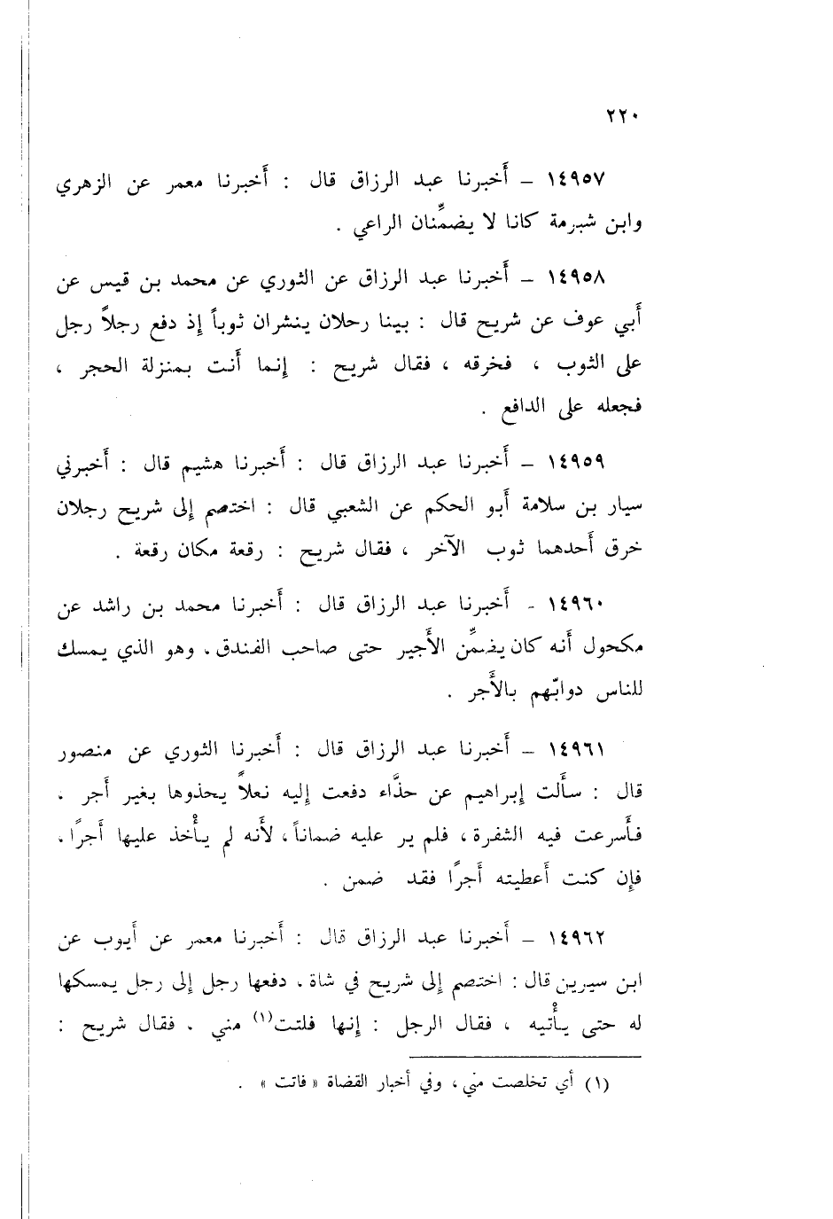 14963 - عَبْدُ الرَّزَّاقِ قَالَ: أَخْبَرَنَا ابْنُ عُيَيْنَةَ، عَنْ مُطَرِّفٍ، عَنِ الشَّعْبِيِّ، عَنْ شُرَيْحٍ قَالَ: «§إِذَا 0000 الْبَعِيرَ بِحِمْلِهِ ضَمِنَ صَاحِبُهُ»