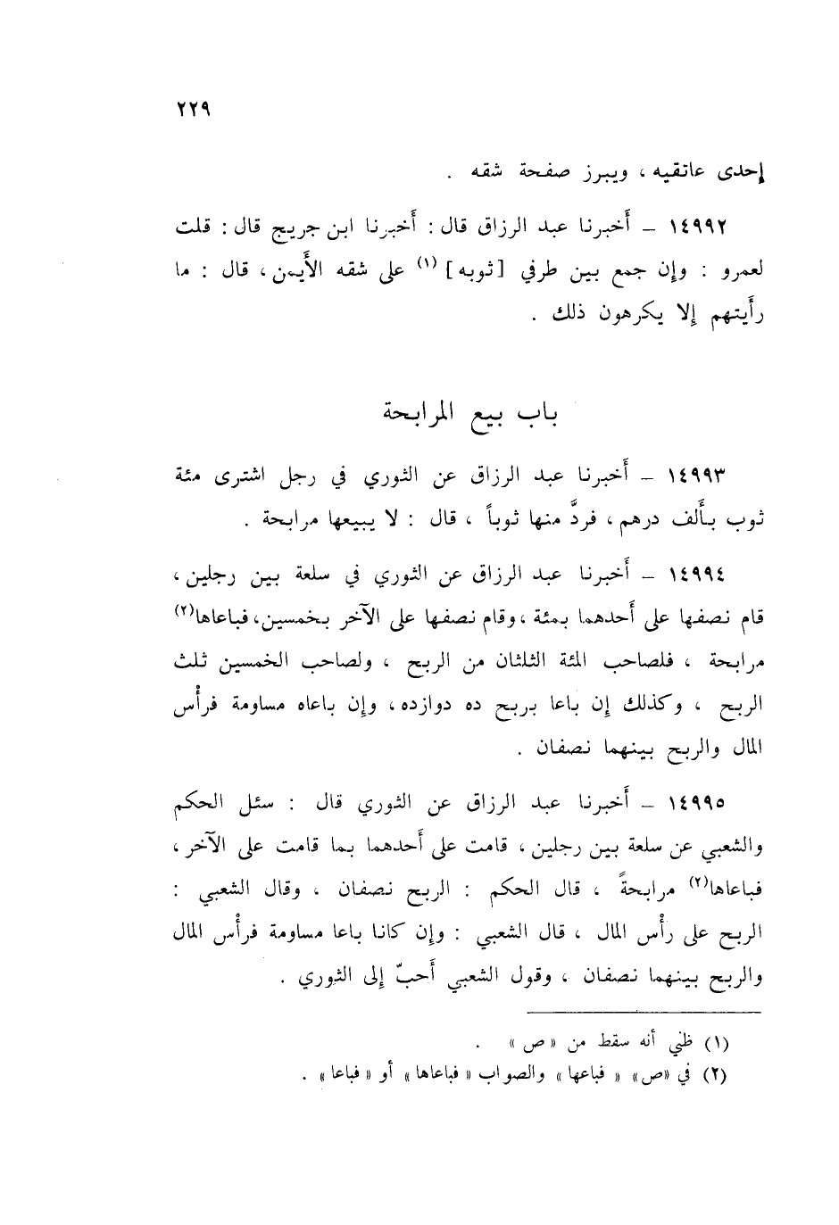 14995 - أَخْبَرَنَا عَبْدُ الرَّزَّاقِ، عَنِ الثَّوْرِيِّ قَالَ: سُئِلَ الْحَكَمُ وَالشَّعْبِيُّ عَنْ §سِلْعَةٍ بَيْنَ رَجُلَيْنِ قَامَتْ عَلَى أَحَدِهِمَا بِمَا قَامَتْ عَلَى الْآخَرِ، فَبَاعَاهَا مُرَابَحَةً، قَالَ الْحَكَمُ: «الرِّبْحُ نِصْفَانِ»، وَقَالَ الشَّعْبِيُّ: «الرِّبْحُ عَلَى رَأْسِ الْمَالِ»، قَالَ الشَّعْبِيُّ: «وَإِنْ كَانَا بَاعَا مُسَاوَمَةً، فَرَأْسُ الْمَالِ وَالرِّبْحُ بَيْنَهُمَا نِصْفَانِ»، «وَقَوْلُ الشَّعْبِيِّ أَحَبُّ إِلَى الثَّوْرِيِّ»