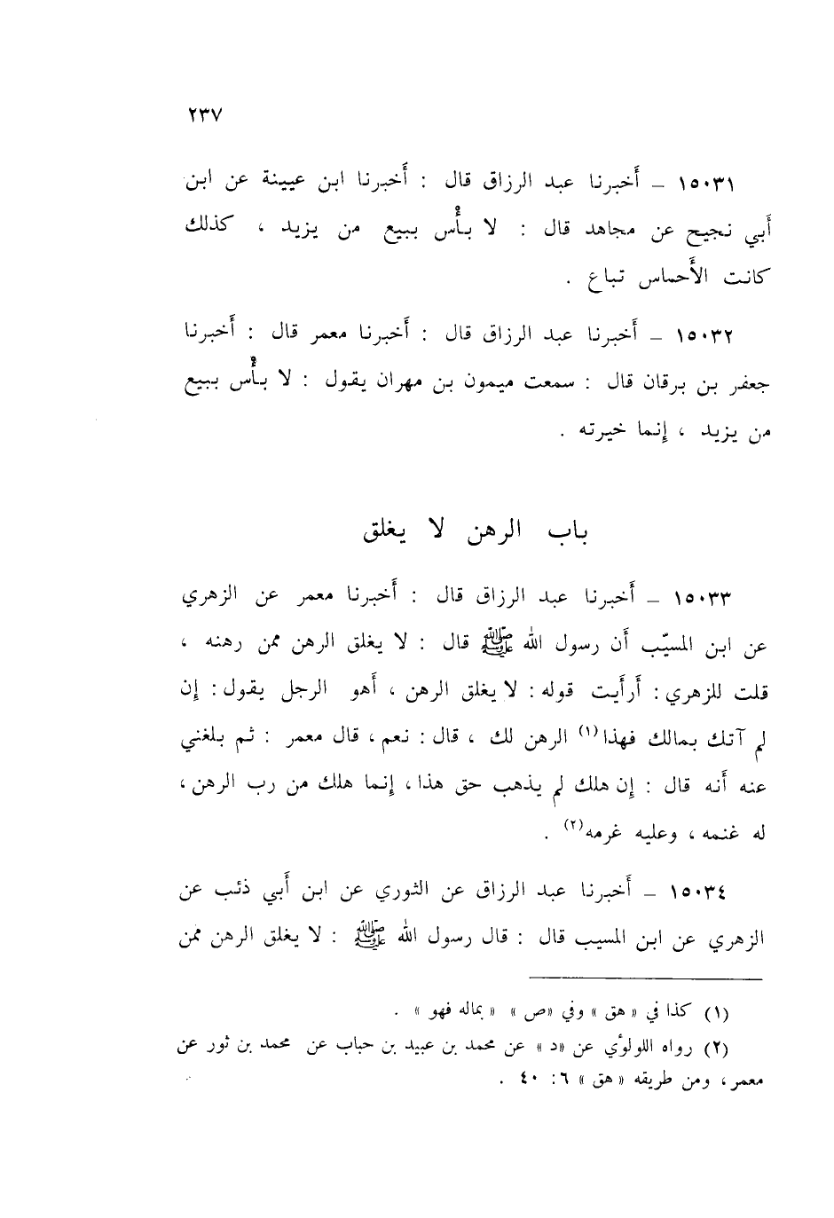 15033 - عَبْدُ الرَّزَّاقِ قَالَ: أَخْبَرَنَا مَعْمَرٌ، عَنِ الزُّهْرِيِّ، عَنِ ابْنِ الْمُسَيِّبِ، أَنَّ رَسُولَ اللَّهِ صَلَّى اللهُ عَلَيْهِ وَسَلَّمَ قَالَ: «§لَا يُغْلَقُ الرَّهْنُ مِمَّنْ رَهَنَهُ»، قُلْتُ لِلزُّهْرِيِّ: أَرَأَيْتَ قَوْلَهُ: «لَا يُغْلَقُ الرَّهْنُ»، أَهُوَ الرَّجُلُ يَقُولُ: إِنْ لَمْ آتِكَ بِمَالِكَ فَهَذَا الرَّهْنُ لَكَ؟ قَالَ: نَعَمْ، قَالَ مَعْمَرٌ: ثُمَّ بَلَغَنِي عَنْهُ أَنَّهُ قَالَ: «إِنْ هَلَكَ لَمْ يَذْهَبْ حَقُّ هَذَا، إِنَّمَا هَلَكَ مَنْ رَبَّ الرَّهْنَ، لَهُ غَنَمُهُ وَعَلَيْهِ غُرْمُهِ»