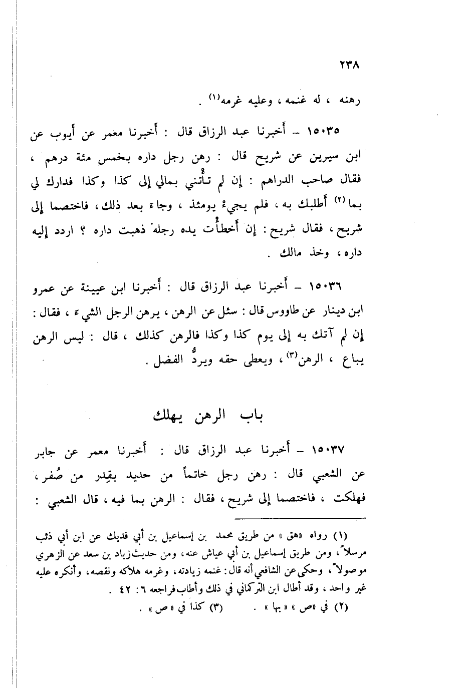 15037 - عَبْدُ الرَّزَّاقِ قَالَ: أَخْبَرَنَا مَعْمَرٌ عَنْ جَابِرٍ، عَنِ الشَّعْبِيِّ قَالَ: رَهَنَ رَجُلٌ خَاتَمًا مِنْ حَدِيدٍ بِقَدْرٍ مِنْ صُفْرٍ، فَهَلَكَتْ فَاخْتَصَمَا إِلَى شُرَيْحٍ، فَقَالَ: «§الرَّهْنُ بِمَا فِيهِ»، قَالَ الشَّعْبِيُّ: «ذَاكَ أَلْفٌ بِدِرْهَمٍ، وَدِرْهَمٌ بِأَلْفٍ»، قَالَ مَعْمَرٌ: وَكَانَ الْحَسَنُ يَقُولُ: «ذَهَبَ الرَّهْنُ بِمَا فِيهِ»