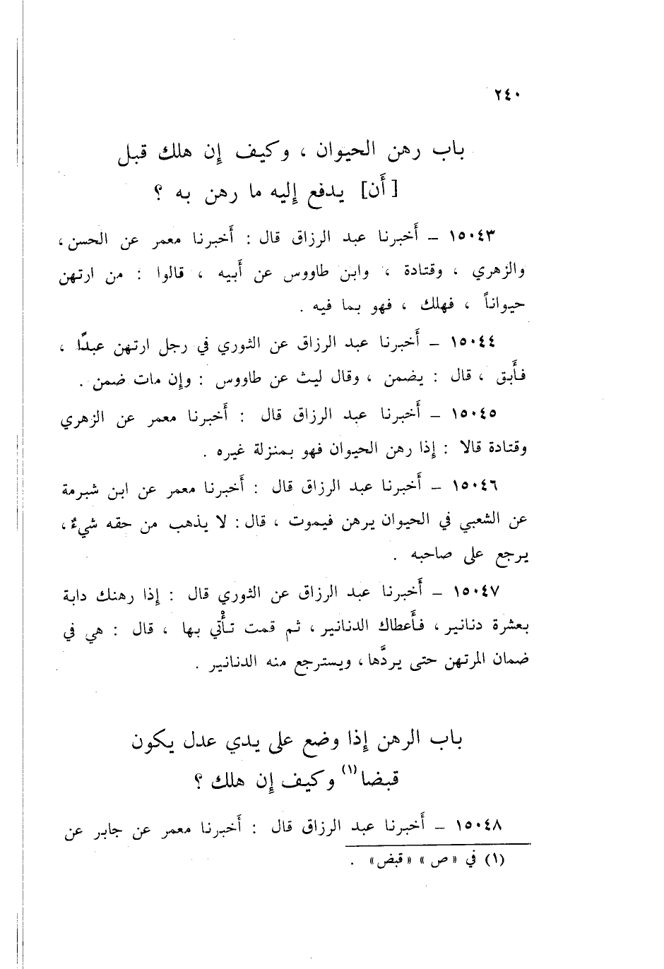 15045 - عَبْدُ الرَّزَّاقِ قَالَ: أَخْبَرَنَا مَعْمَرٌ، عَنِ الزُّهْرِيِّ، وَقَتَادَةَ، قَالَا: «§إِذَا رُهِنَ الْحَيَوَانُ فَهُوَ بِمَنْزِلَةِ غَيْرِهِ»