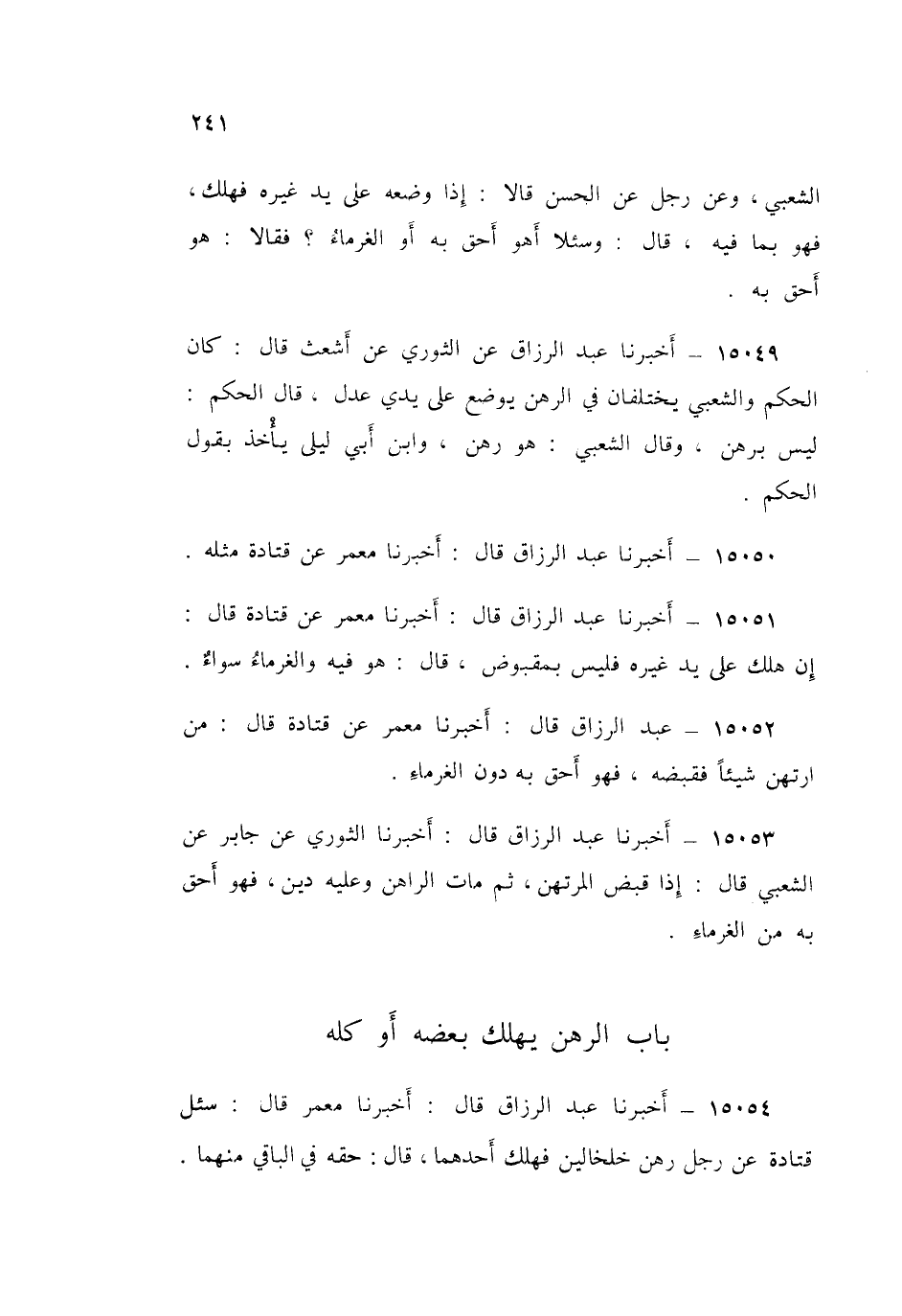 15055 - عَبْدُ الرَّزَّاقِ قَالَ: أَخْبَرَنَا الثَّوْرِيُّ، عَنِ الْقَعْقَاعِ، عَنْ إِبْرَاهِيمَ قَالَ فِي §الرَّهْنِ: «إِذَا كَانَ أَكْثَرَ ثُمَّ ذَهَبَ مِنْهُ شَيْءٌ، ذَهَبَ مِنَ الْحَقِّ بِقَدْرِ مَا ذَهَبَ مِنَ الرَّهْنِ، وَإِذَا كَانَ الْحَقُّ أَكْثَرَ، ذَهَبَ مِنَ الْحَقِّ الَّذِي ذَهَبَ مِنَ الرَّهْنِ»