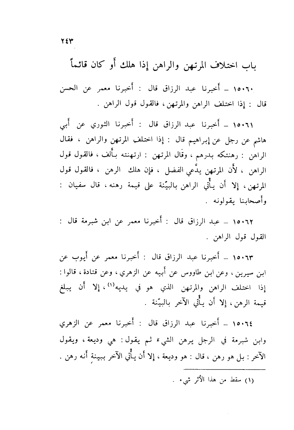 15063 - عَبْدُ الرَّزَّاقِ قَالَ: أَخْبَرَنَا مَعْمَرٌ، عَنْ أَيُّوبَ، عَنِ ابْنِ سِيرِينَ، وَعَنِ ابْنِ طَاوُسٍ، عَنْ أَبِيهِ، وَعَنِ الزُّهْرِيِّ، وَعَنْ قَتَادَةَ قَالُوا: «§إِذَا اخْتَلَفَ الرَّاهِنُ وَالْمُرْتَهِنُ الَّذِي هُوَ فِي يَدَيْهِ، إِلَّا أَنْ يَبْلُغَ قِيمَةَ الرَّهْنِ، إِلَّا أَنْ يَأْتِيَ الْآخَرُ بِالْبَيِّنَةِ»