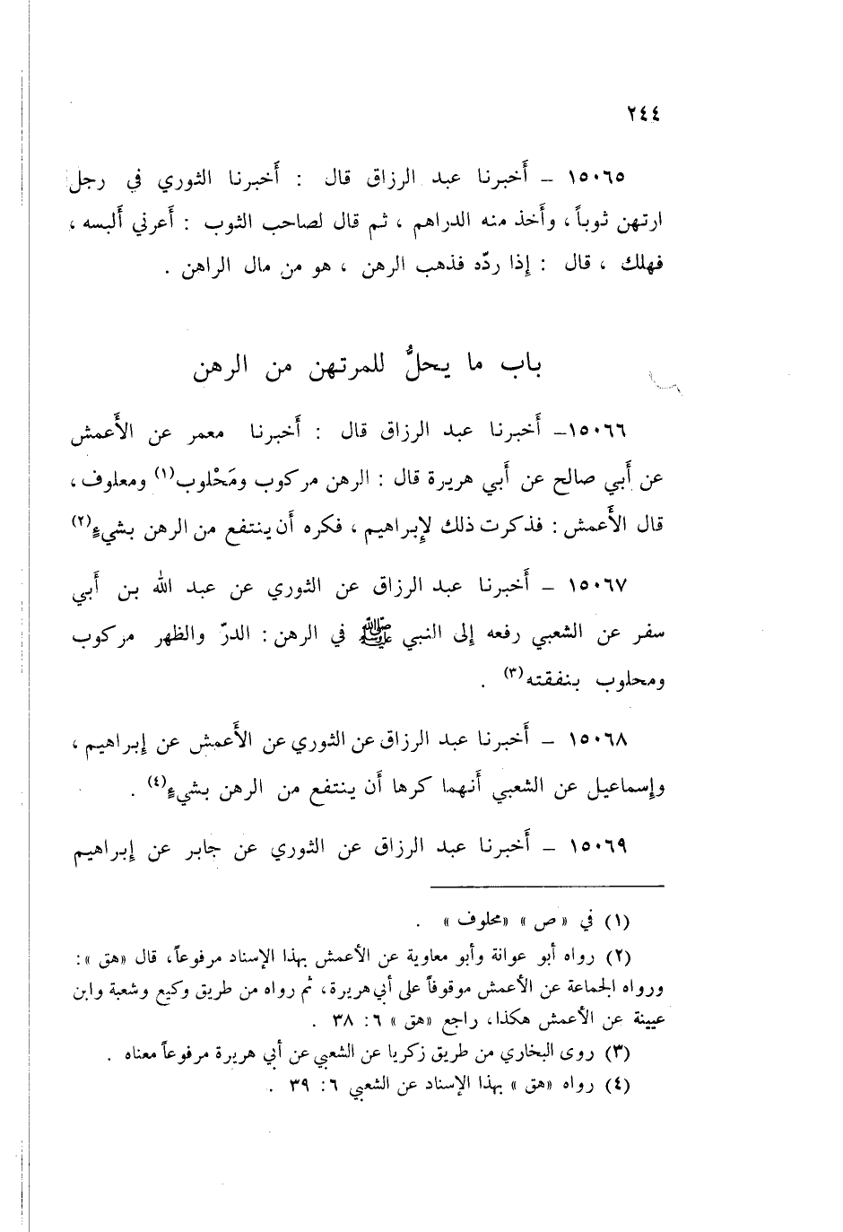 15066 - عَبْدُ الرَّزَّاقِ قَالَ: أَخْبَرَنَا مَعْمَرٌ، عَنِ الْأَعْمَشِ، عَنْ أَبِي صَالِحٍ، عَنْ أَبِي هُرَيْرَةَ قَالَ: «§الرَّهْنُ مَرْكُوبٌ، وَمَحْلُوبٌ، وَمَعْلُوفٌ» قَالَ الْأَعْمَشُ: فَذَكَرْتُ ذَلِكَ لِإِبْرَاهِيمَ «فَكَرِهَ أَنْ يَنْتَفِعَ مِنَ الرَّهْنِ بِشَيْءٍ»